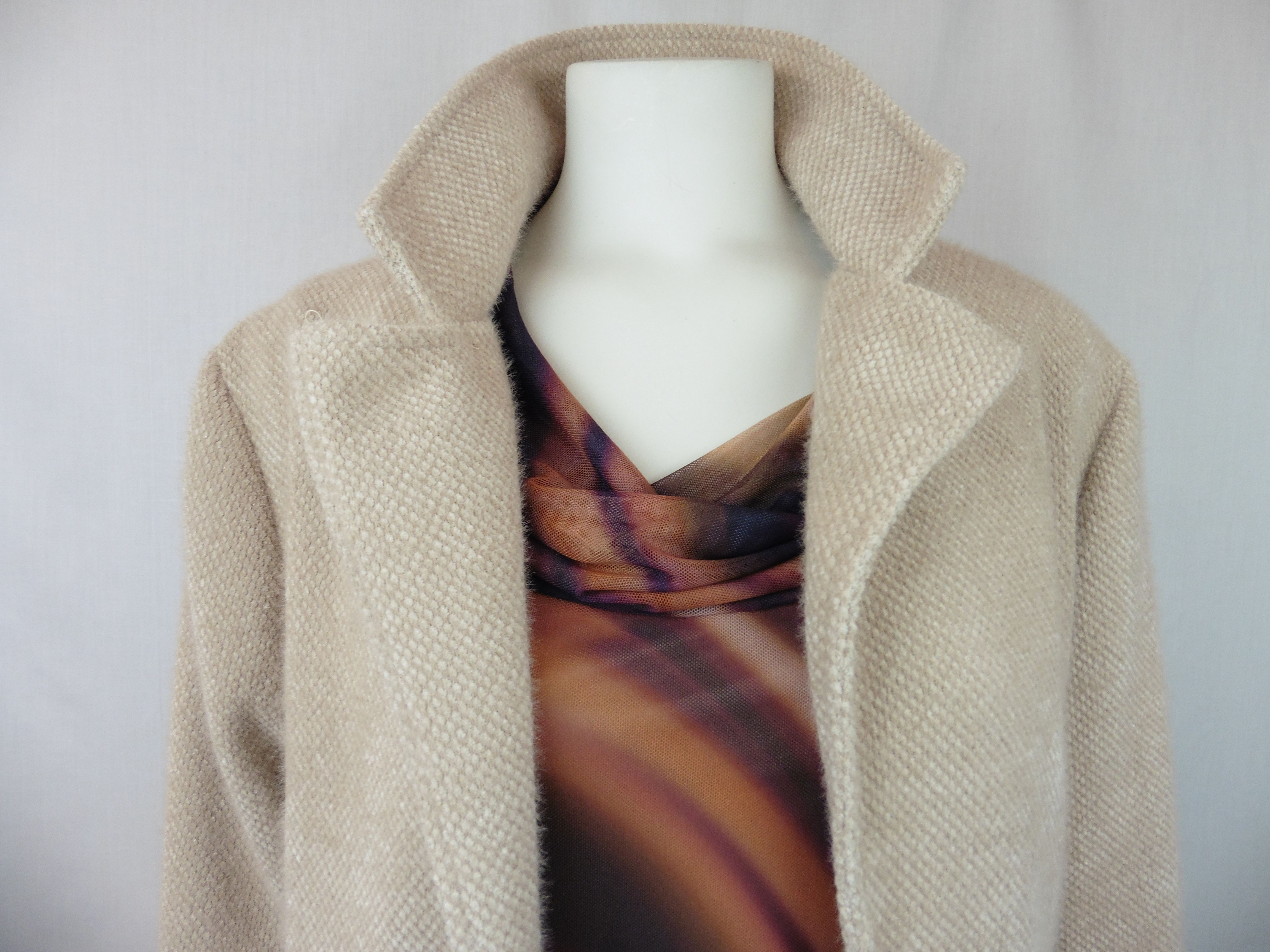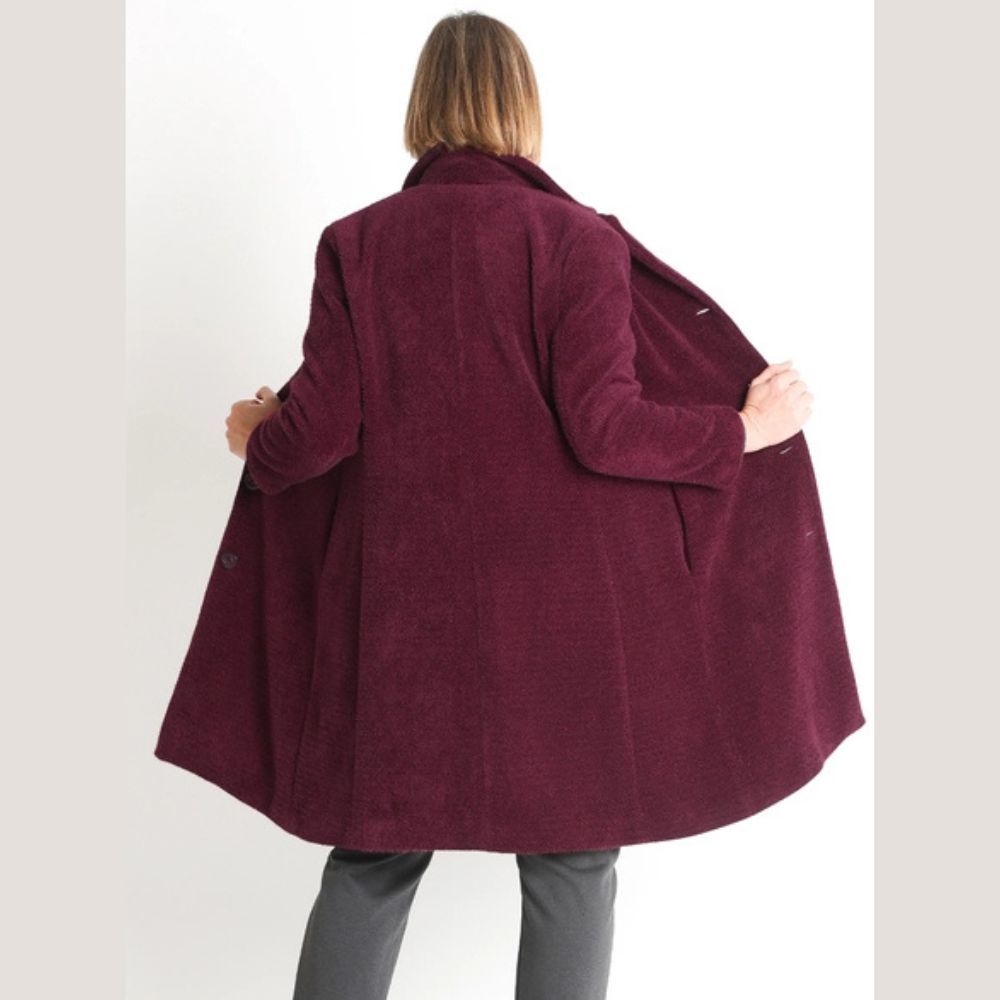 Abrigo de Lourdes Castillo, 55% poliéster 45% poliamida, sin acolchado, cuello solapa, dos bolsillos de ojal, en color burdeos haciendo dibujo en relieve con pelo