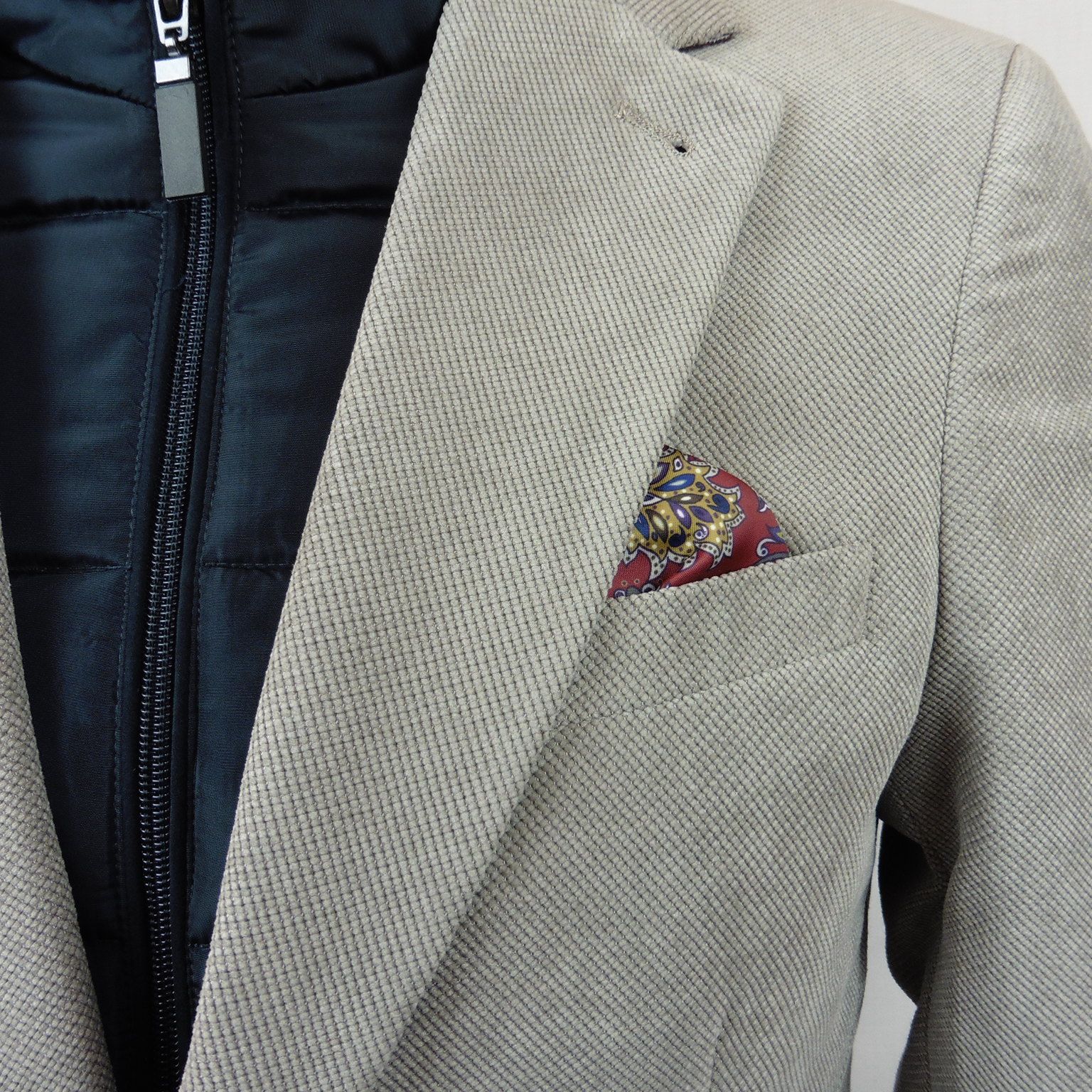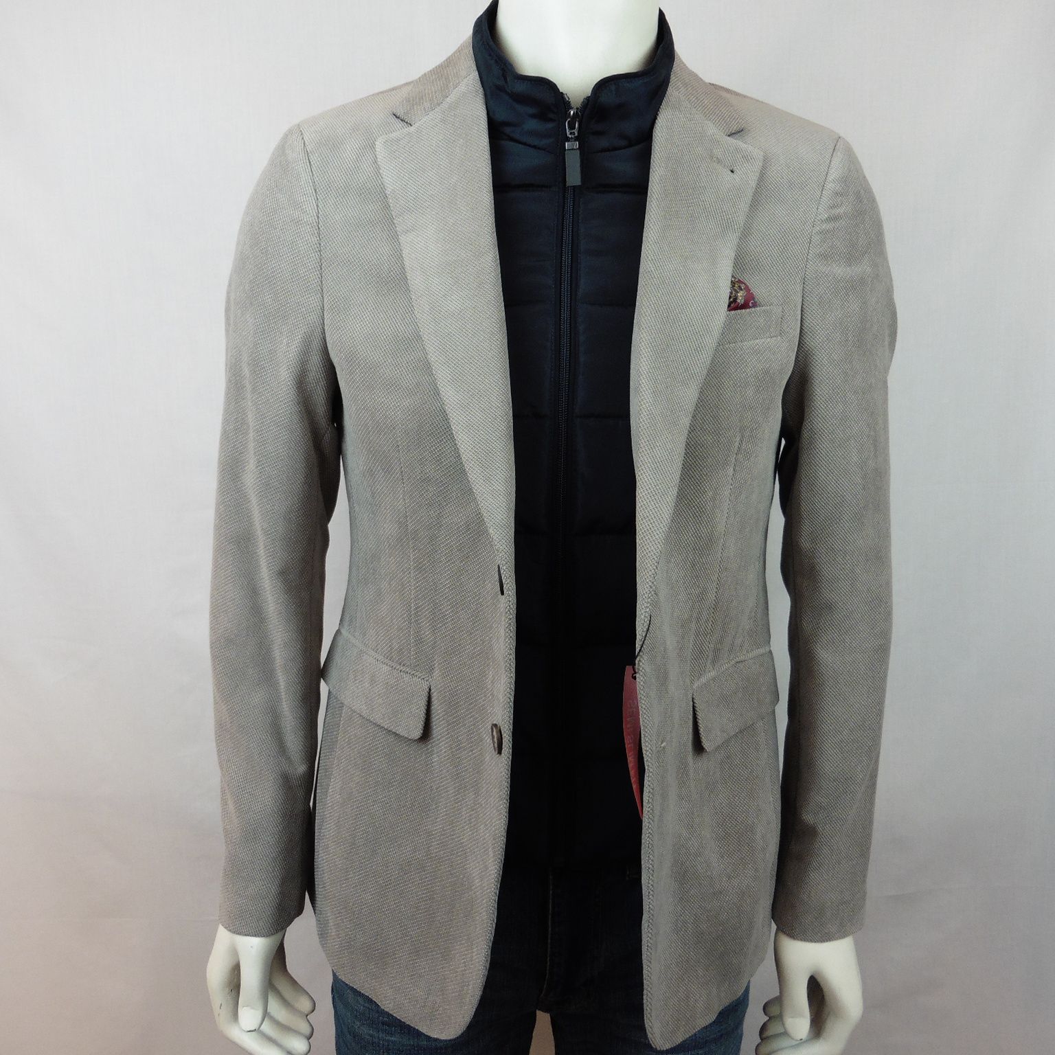 Americana de Alexander & Co., 85% poliéster 15% nailon, pana cortada en color beige, semi entallada con dos cortes traseros, parte delantera simulando chaleco desmontable con cremallera en color azul marino