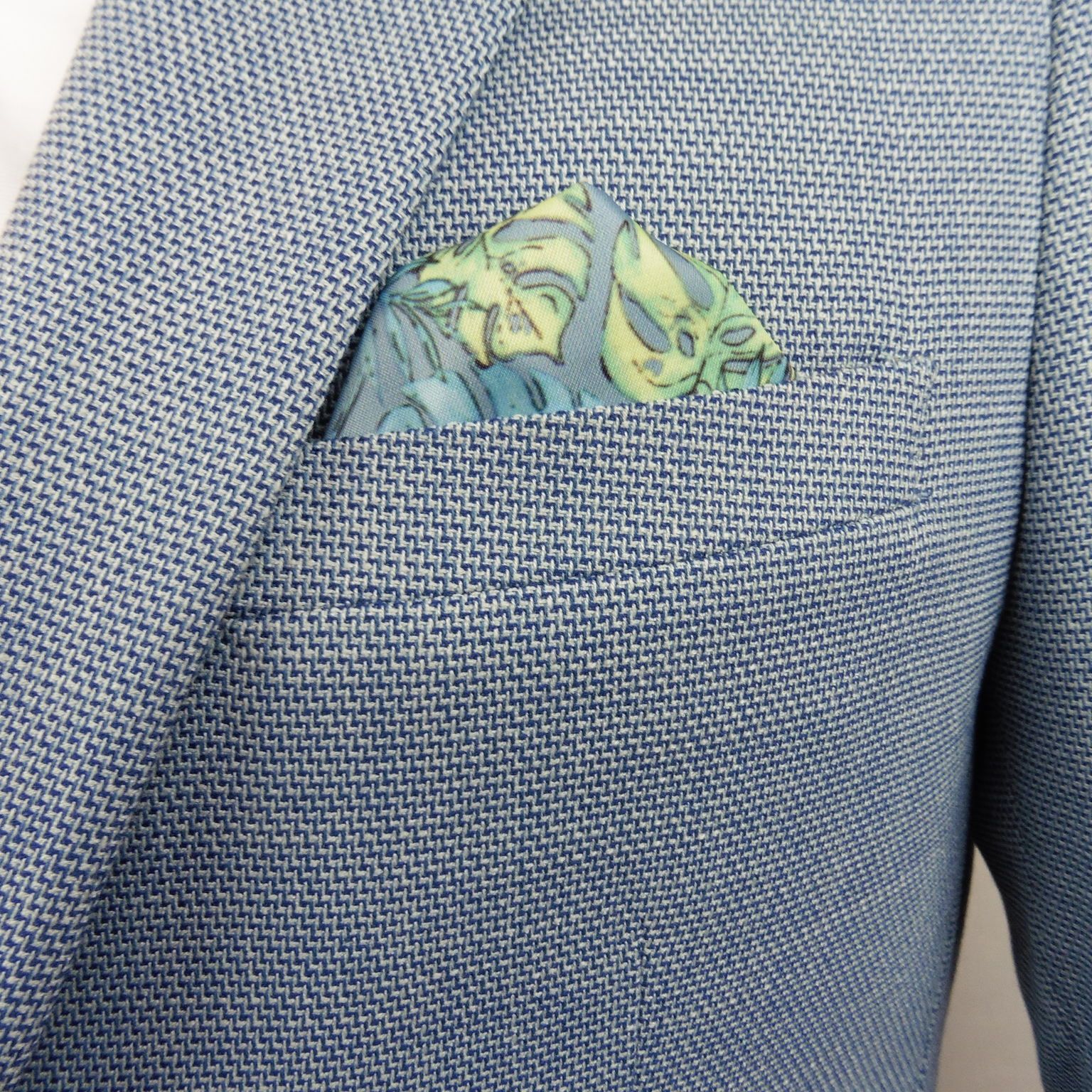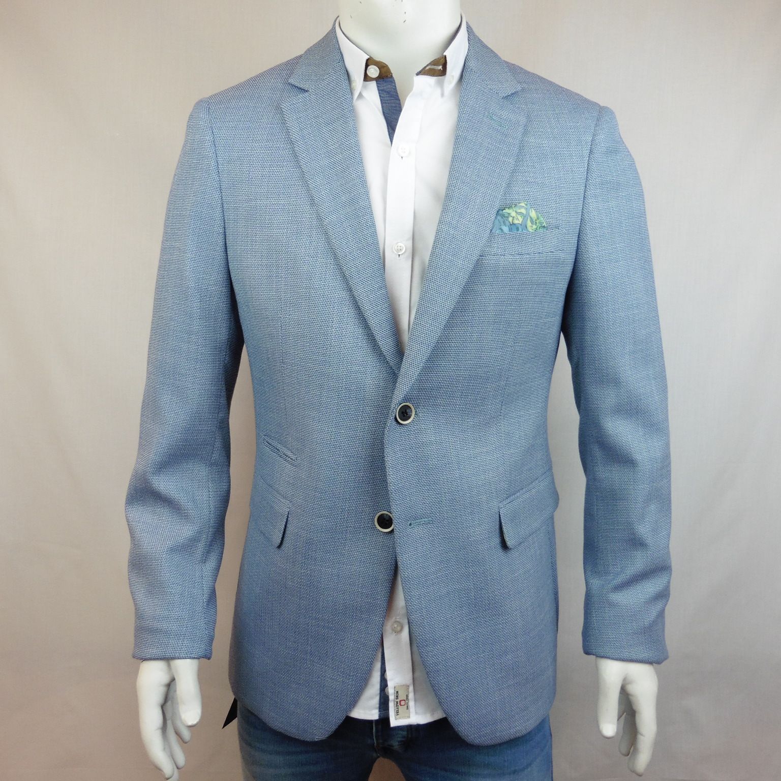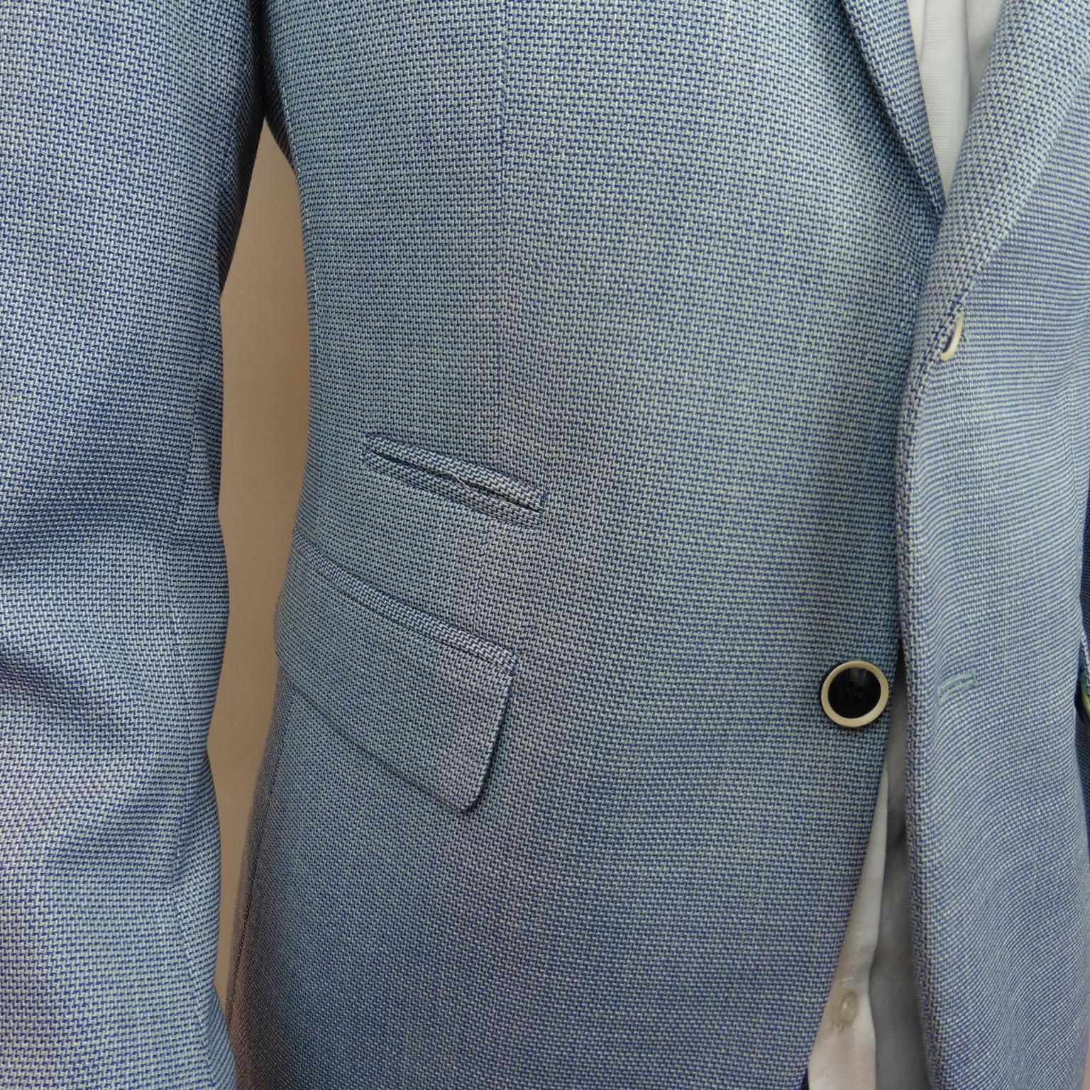 Americana de Alexander & Co., 68% poliéster 30% viscosa 2% elastano, semi entallada con dos cortes traseros, semi forrada, tejido tipo rústico en color azul y blanco