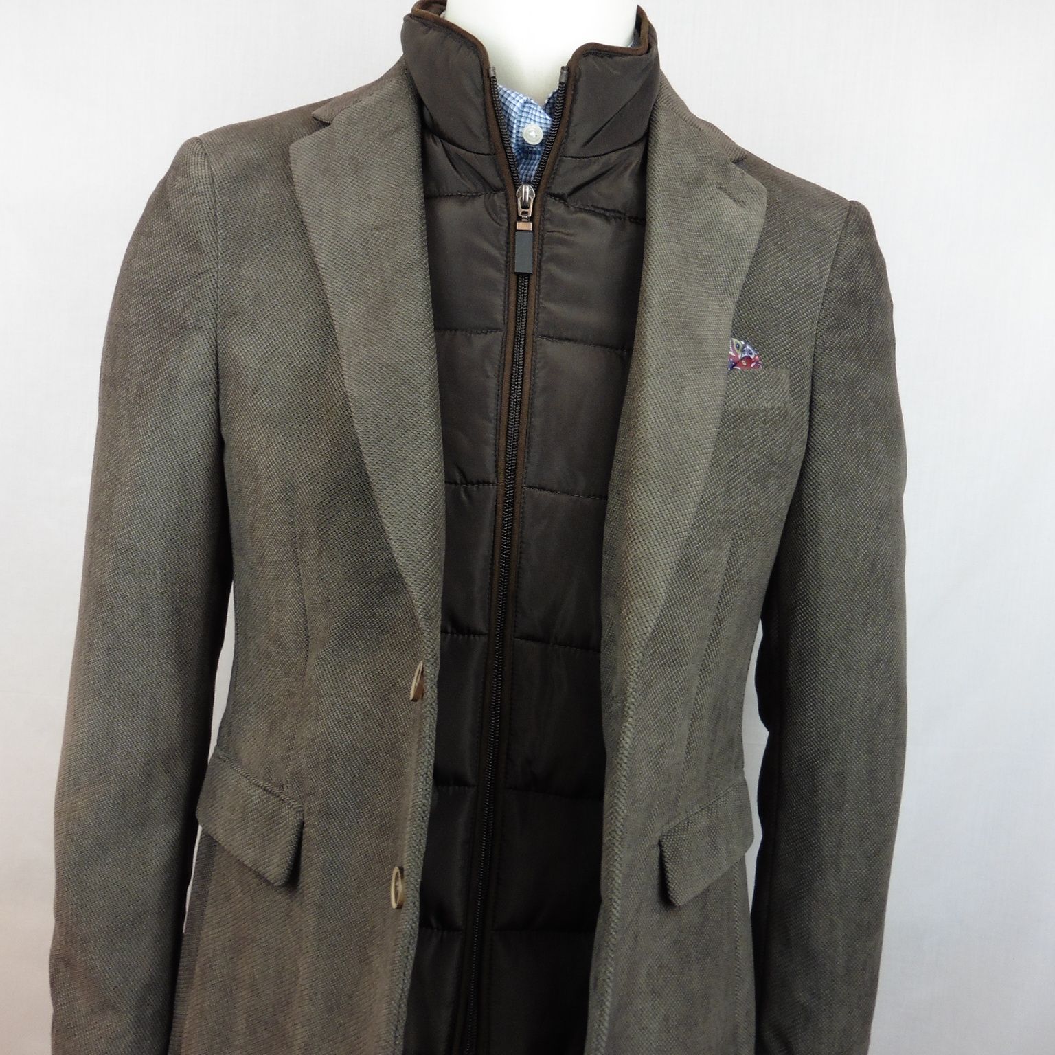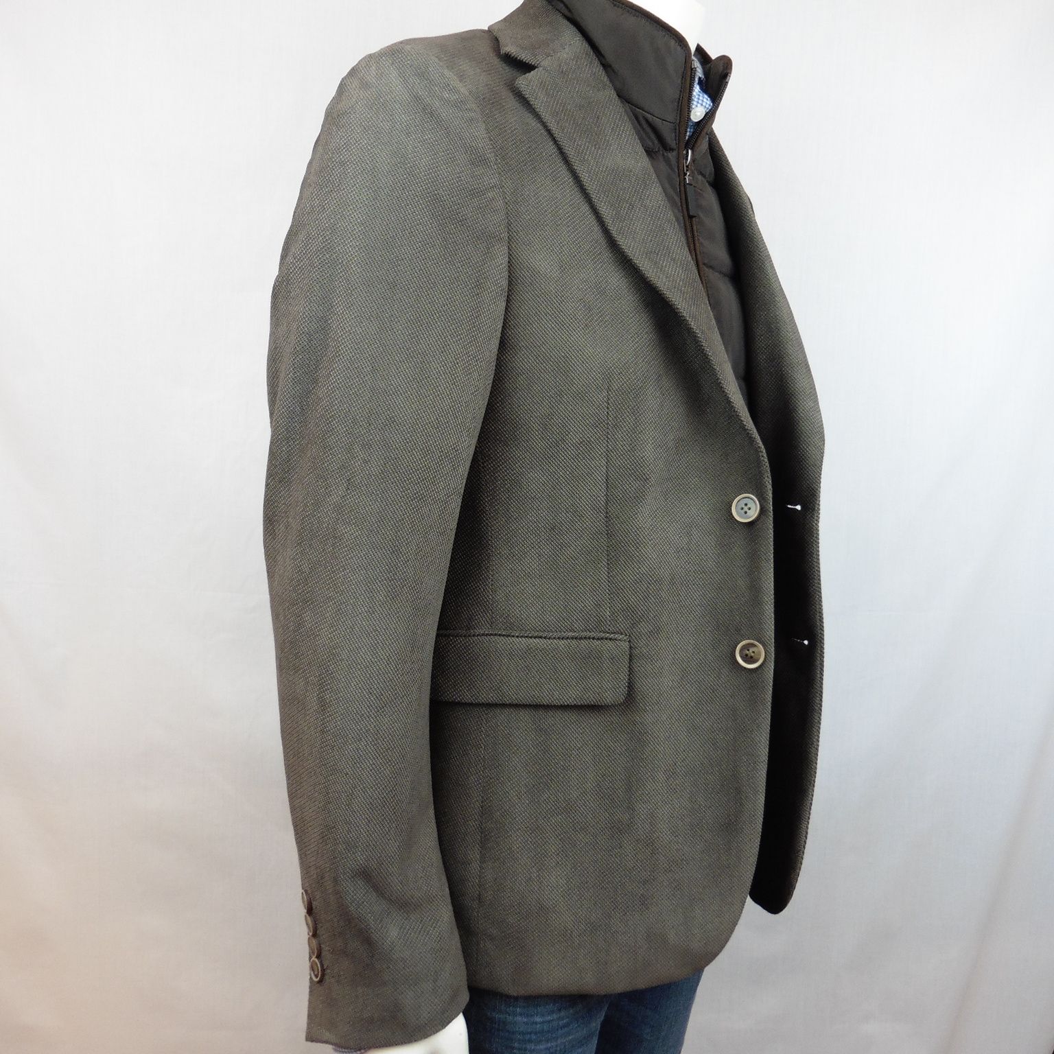 Americana de Alexander & Co., 85% poliéster 15% nailon, pana cortada en color marrón, semi entallada con dos cortes traseros, parte delantera simulando chaleco desmontable con cremallera en color marrón