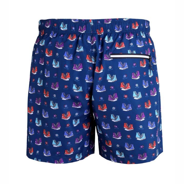 Bañador de N&S, 100% poliéster-microfibra 50D, secado rápido, transpirable, slip de rejilla, bolsillos en costuras laterales, bolsillo trasero con cremallera invertida, en color azul con estampado senakers de colores