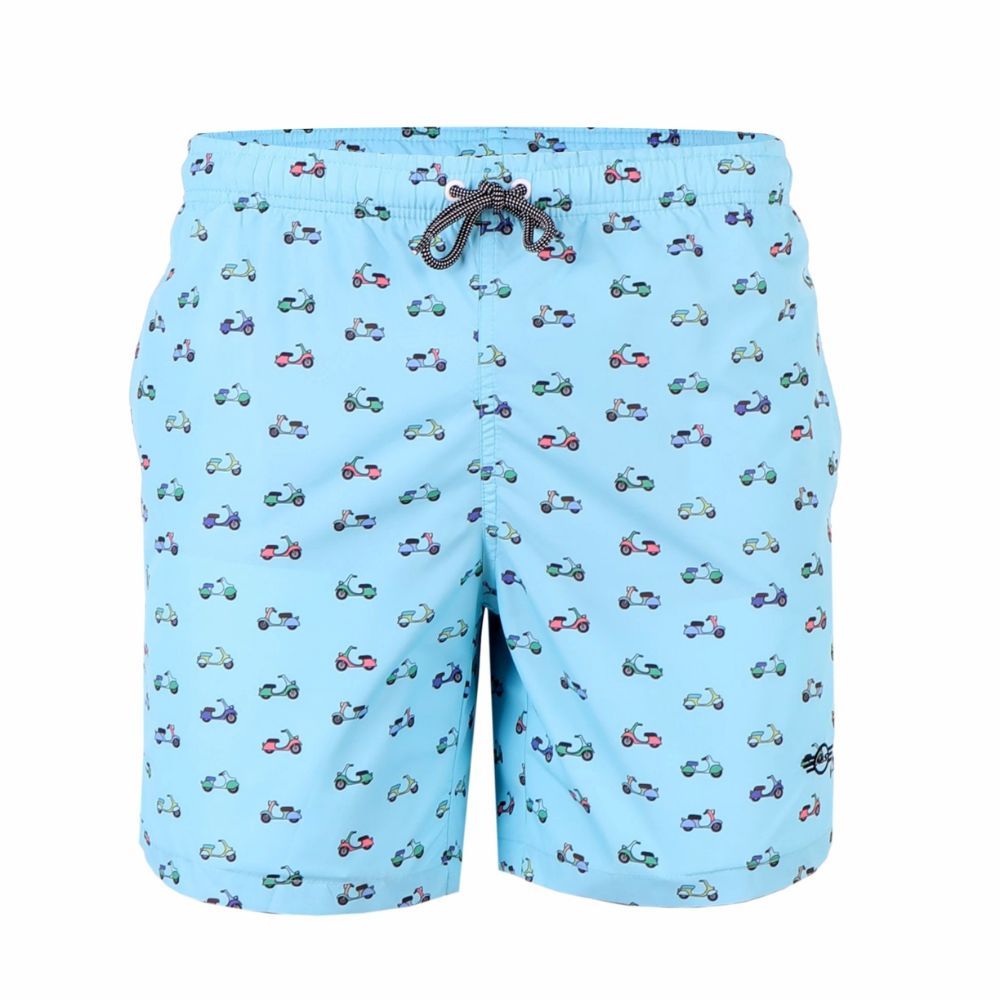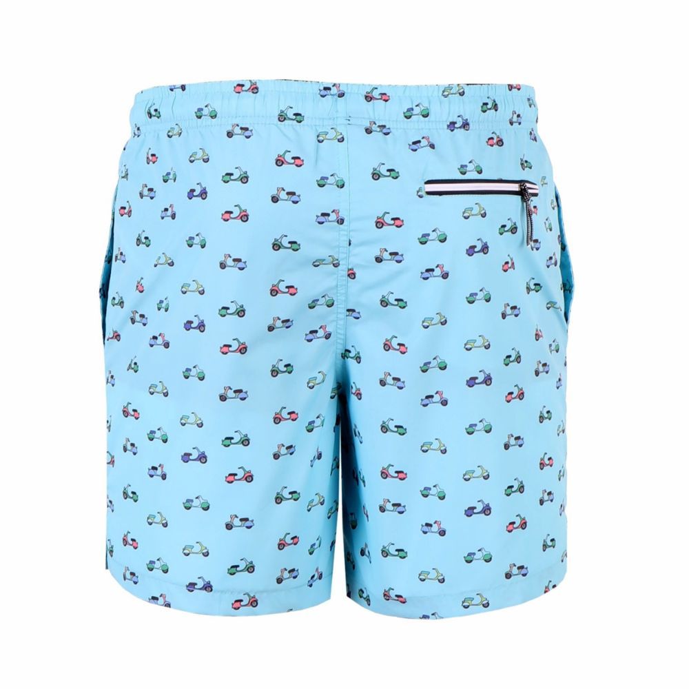Bañador de N&S, 100% poliéster-microfibra 50D, secado rápido, transpirable, slip de rejilla, bolsillos en costuras laterales, bolsillo trasero con cremallera invertida, en color turquesa con estampado de vespas multi color