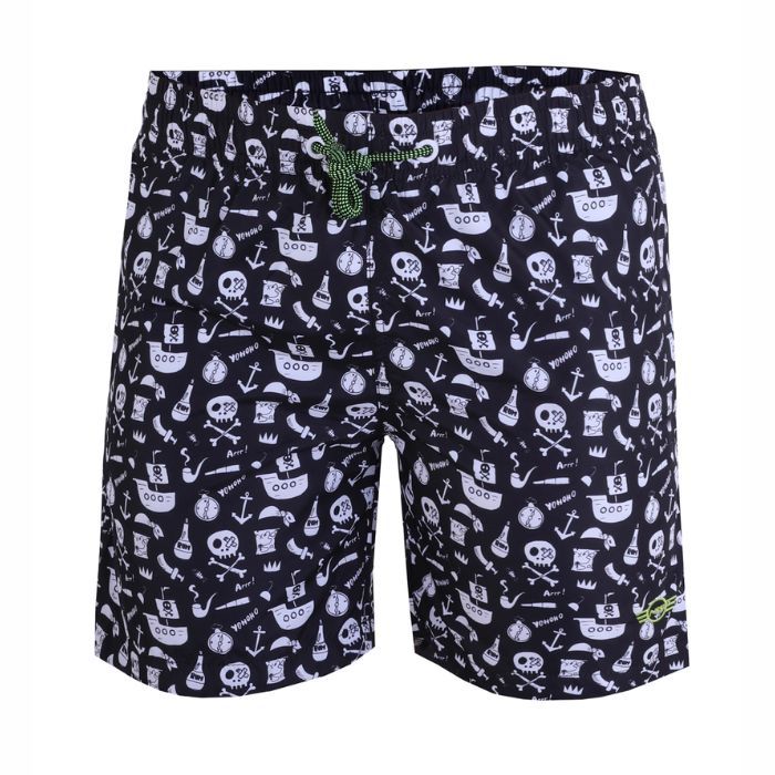 Bañador de N&S, 100% poliéster-microfibra 50D, secado rápido, transpirable, slip de rejilla, bolsillos en costuras laterales, bolsillo trasero con cremallera invertida, en color negro con estampado piratas blanco