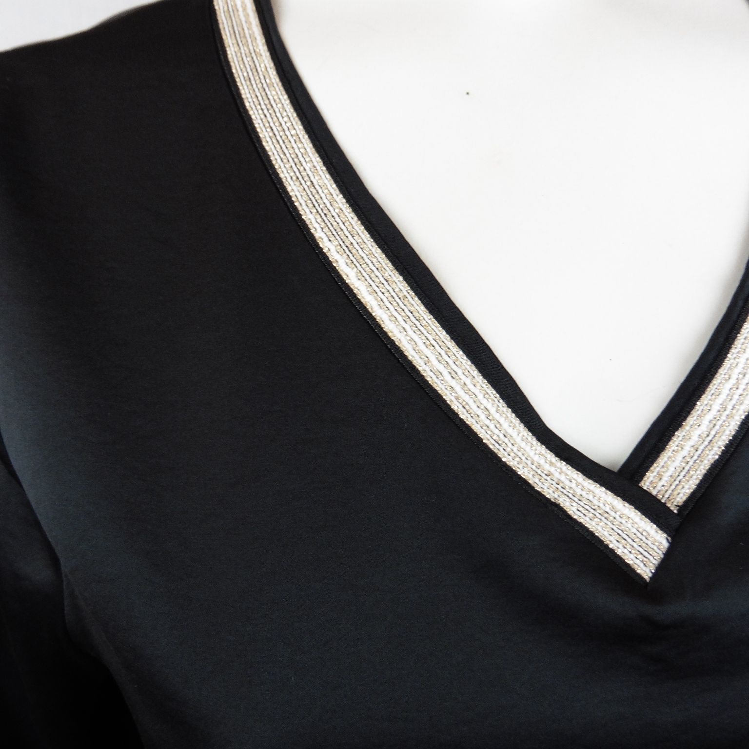 Blusa de Lourdes Castillo, 64% viscosa 36% poliéster, escote pico, cortes laterales, en color negro con vivo dorado en cuello y puños