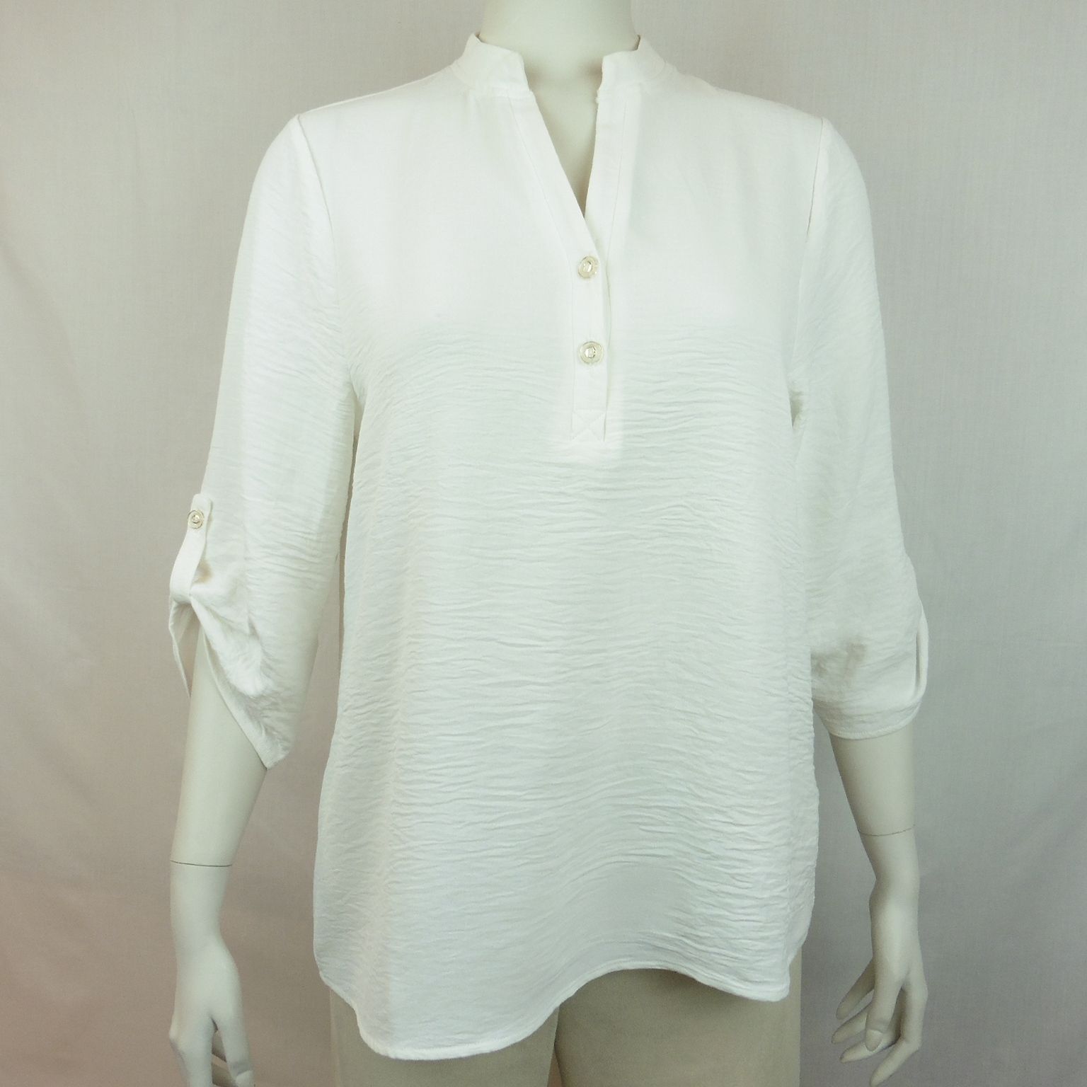 Blusa de Nayat, 95% poliéster 5% elastano, escote en uve con cuello maho, manga al codo con tira interior para recogerla, en color blanco