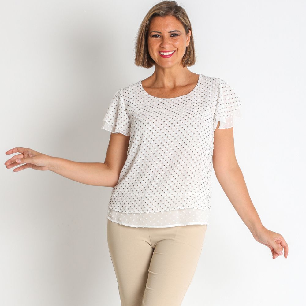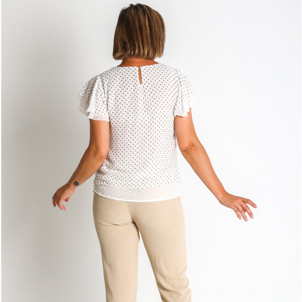 Blusa de Nayat, 100% poliéster, de gasa plumeti, escote redondo con botón detrás, manga corta tipo volante, forma evasé, en color blanco con mini dibujo en tonos marrones