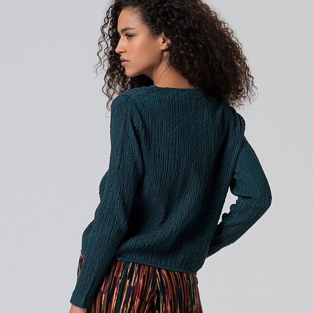 Blusa de Surkana, 65% algodón 30% poliéster 5% elastano, escote redondo, goma en el bajo, engomada formando rombos, en color verde