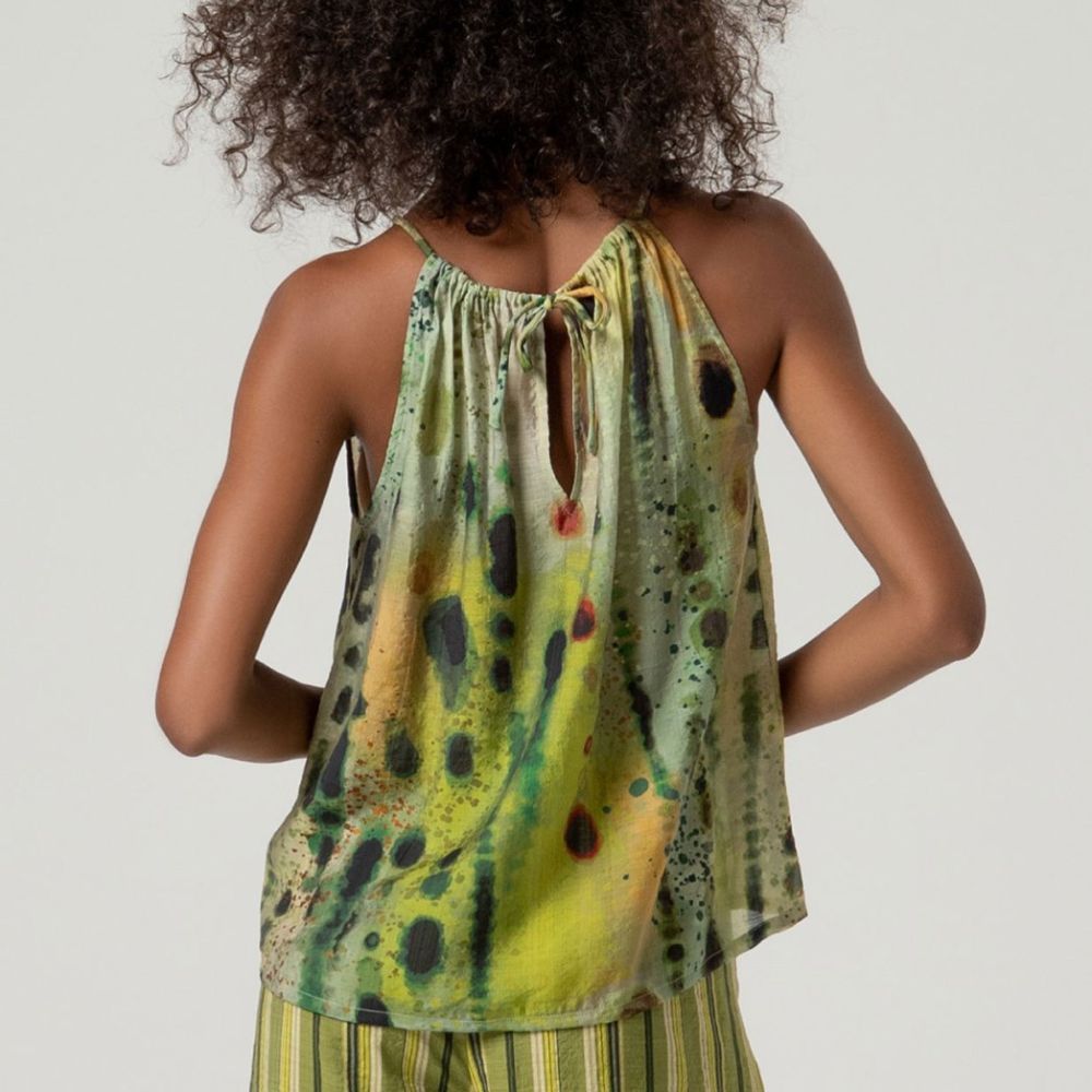 Blusa de Surkana, 70% viscosa 30% poliamida, con estampado acuarela en tonos verdes, tirantes finos anudados detrás con escote fruncido