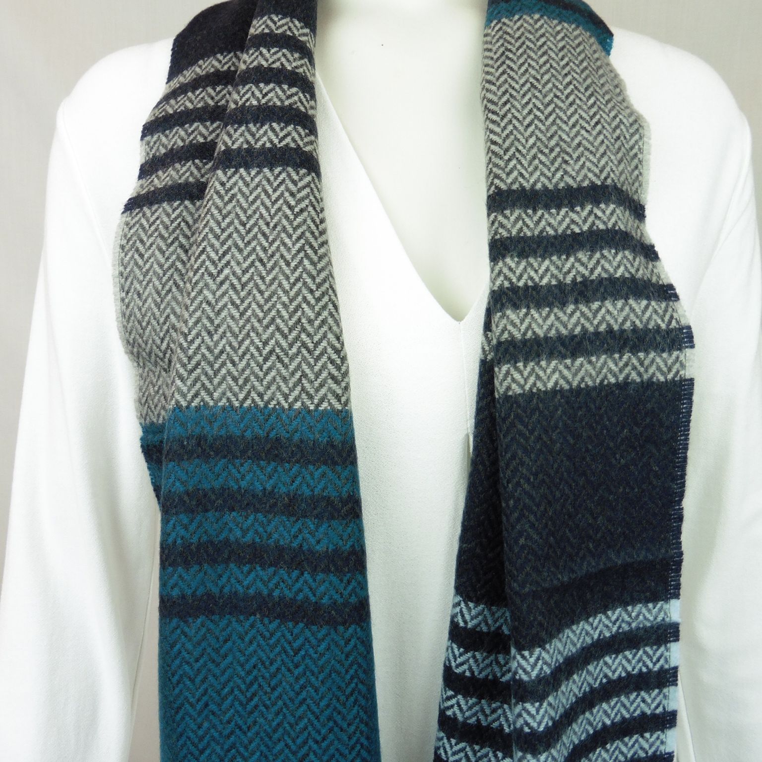 Bufanda estrecha de Boccola, 100% acrílico, de rayas y espigas en tonos azul plomo, gris y blanco