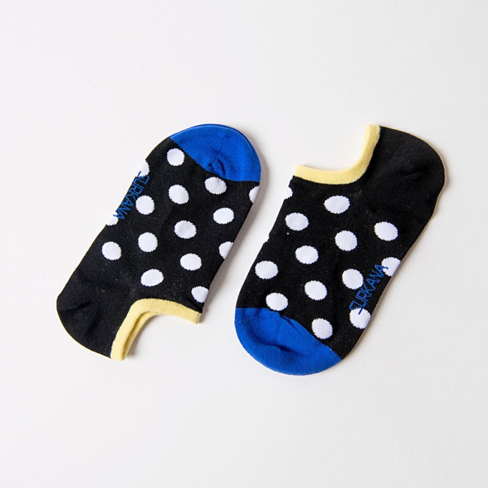 Calcetín invisible de Surkana, 65% algodón 32% nylon 3% elástico,  en color negro con lunares blancos, puntera en color azulon y goma en color amarillo