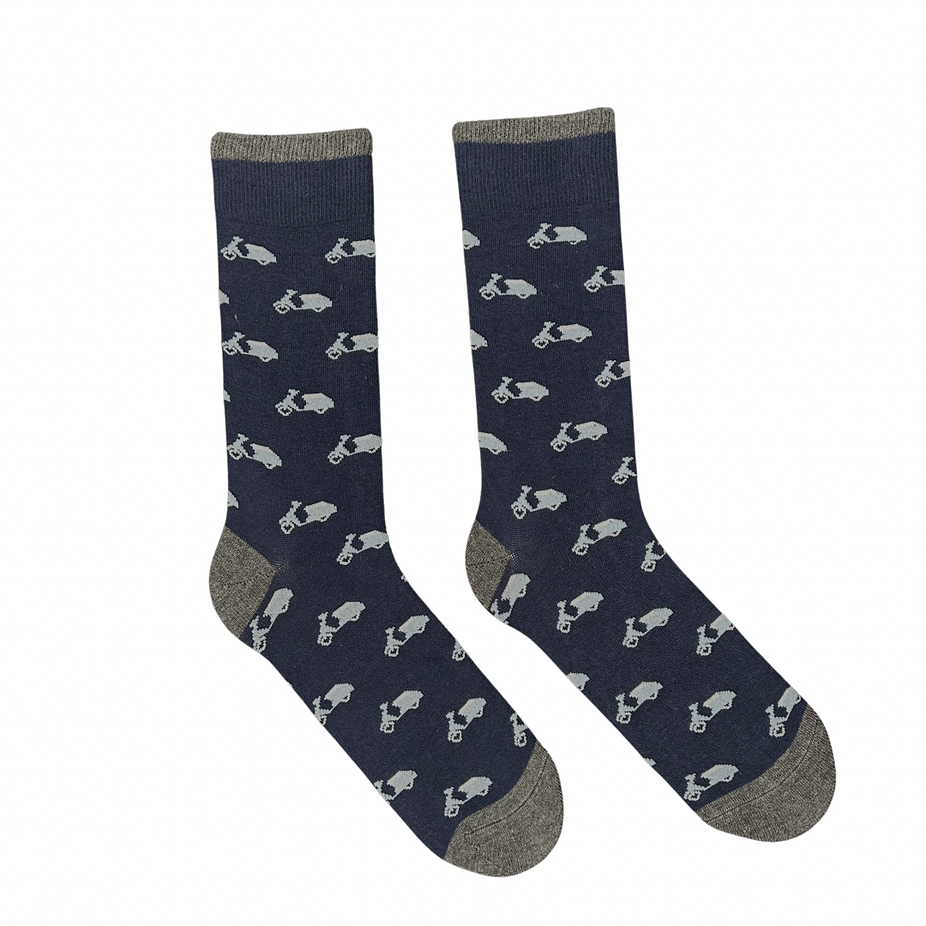 Calcetines de Jorigu, 80% algodón 17% poliamida 3% elastano, en color azul marino con dibujos de vespas azules, puntera, talonera y goma en color gris