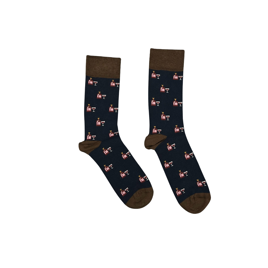 Calcetines de Jorigu, 80% algodón 17% poliamida 3% elastano, en color azul marino con dibujos de botellas de vino y copas, puntera, talonera y goma en color marrón