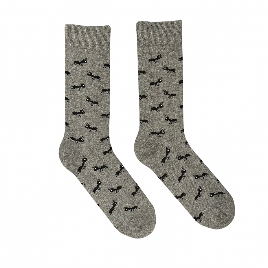 Calcetines de Jorigu, 80% algodón 17% poliamida 3% elastano, en color gris con dibujos de hormigas