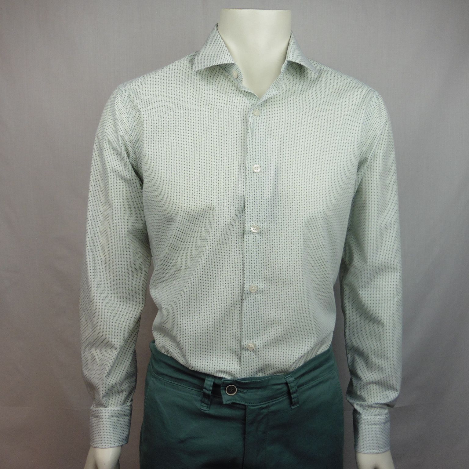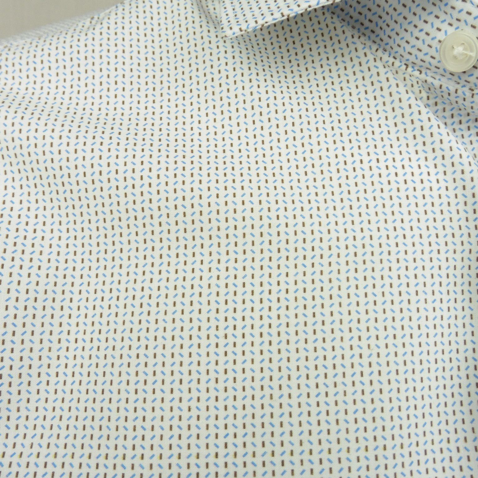 Camisa de Corsare, 60% algodón 40% poliéster, cuello con ballena, en color blanco con mini guiones en tonos verdes y azules