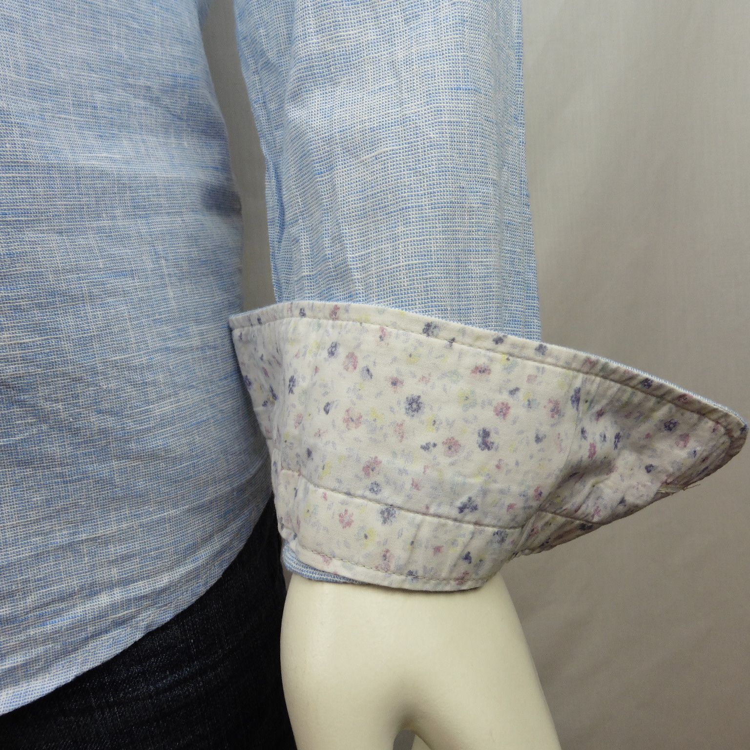 Camisa de Corsare, 50% lino 50% algodón, cuello con ballena extraible, falso liso en color azul celeste con blanco, interiores de tela estampada