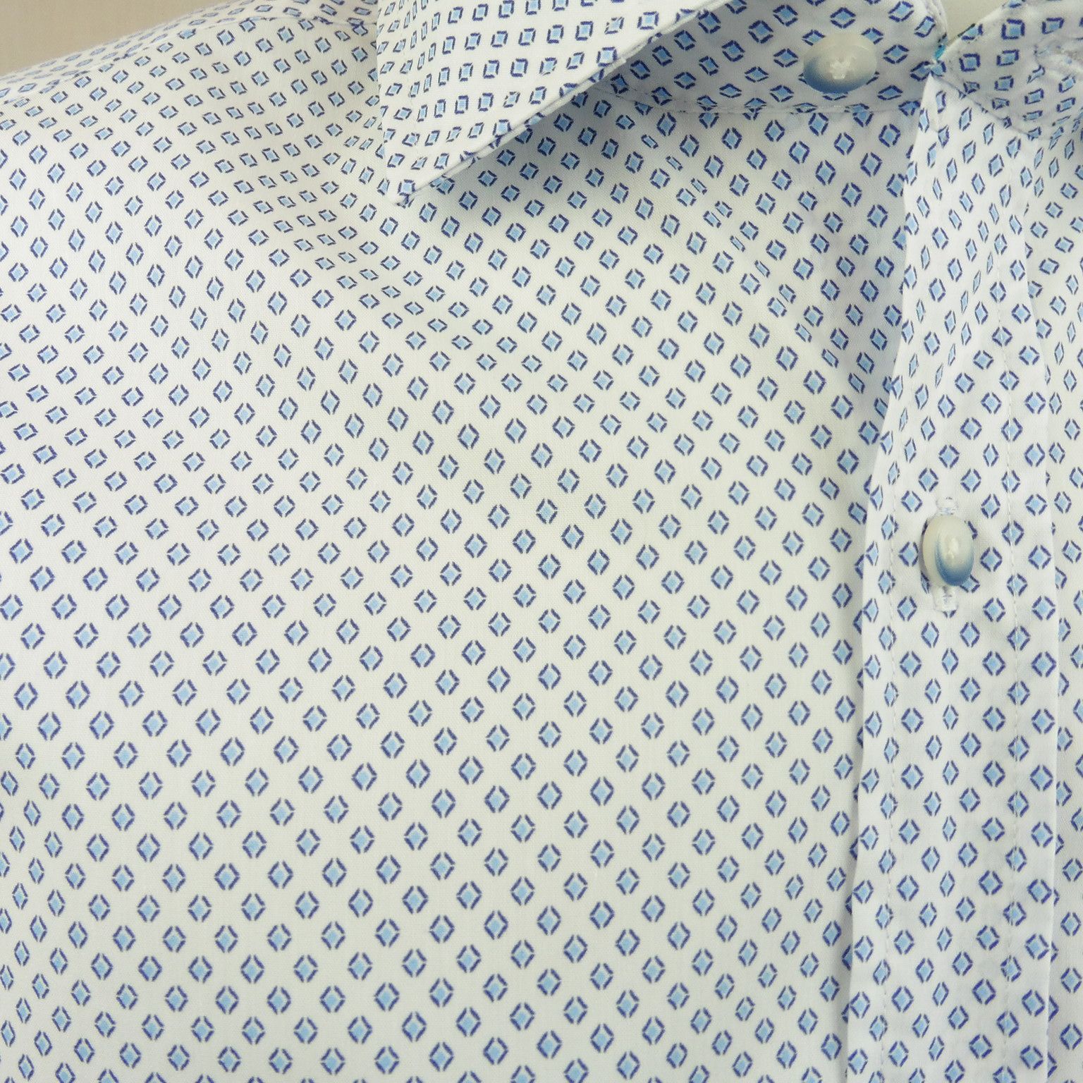 Camisa de Corsare, 100% algodón, cuello italiano para corbata, de manga larga, en color blanco con mini rombos azules