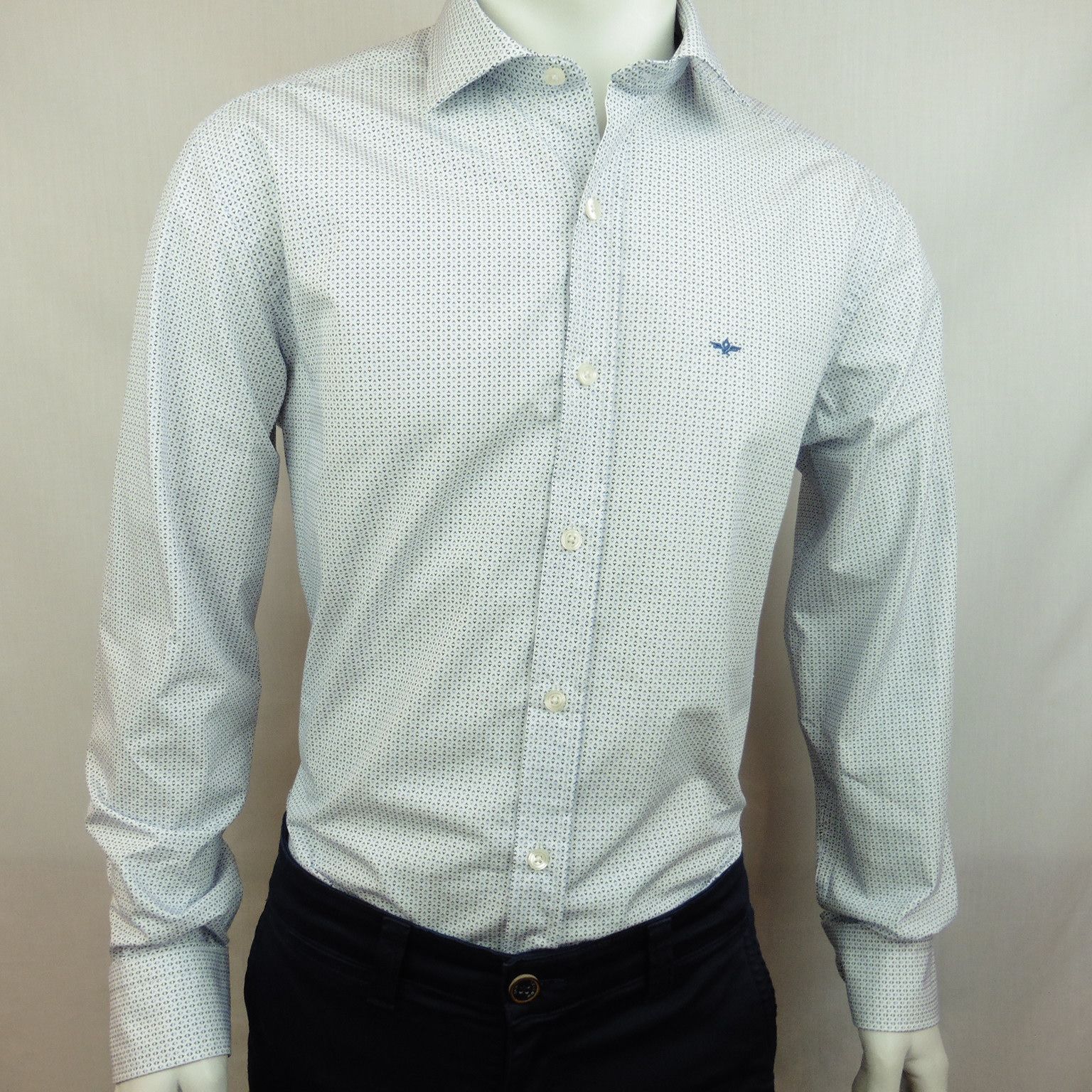 Camisa de Corsare, 100% algodón, entallada con pinzas en la espalda, en color blanco con mini triángulos en tonos azules, cuello italiano