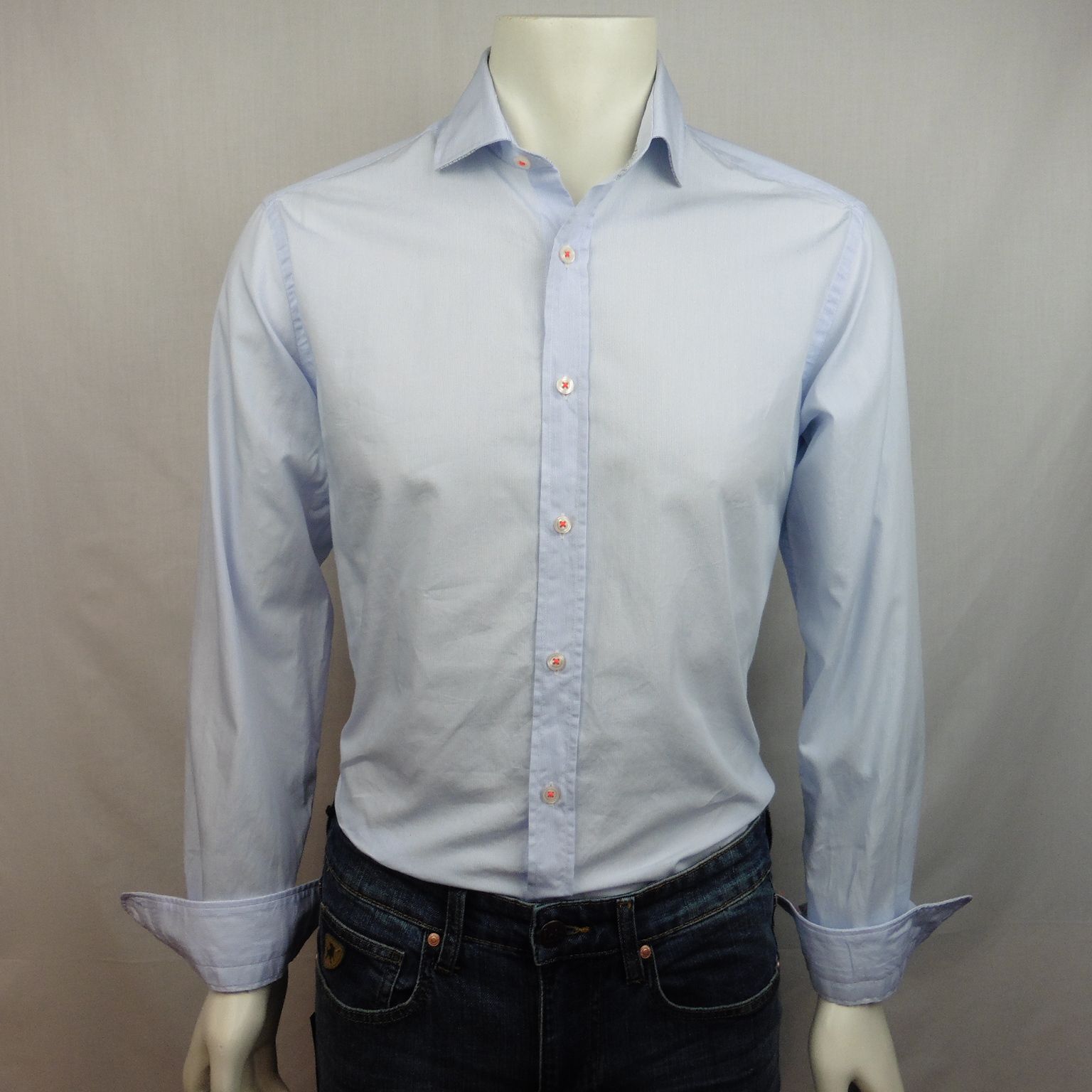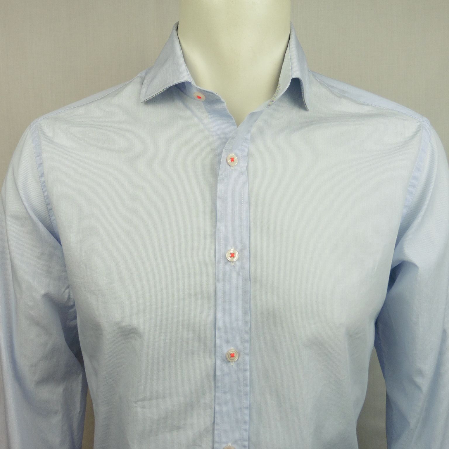 Camisa de Corsare, 100% algodón, cuello con barillas extraibles, con mil rayas en tonos celeste y blanco, hilo de botones en contraste en tono naranja