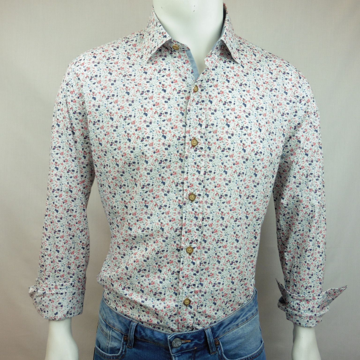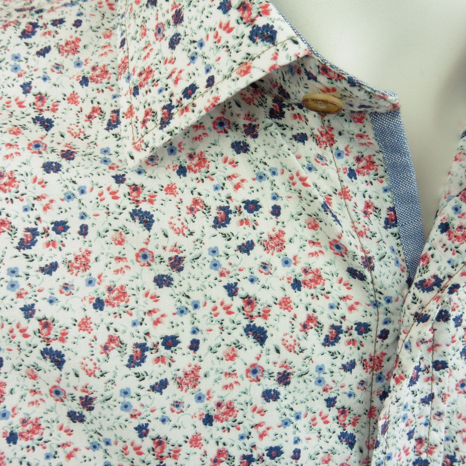 Camisa de Corsare, 100% algodón, cuello blando, fondo blanco con estampado de flores pequeñas en tonos azul y rojo