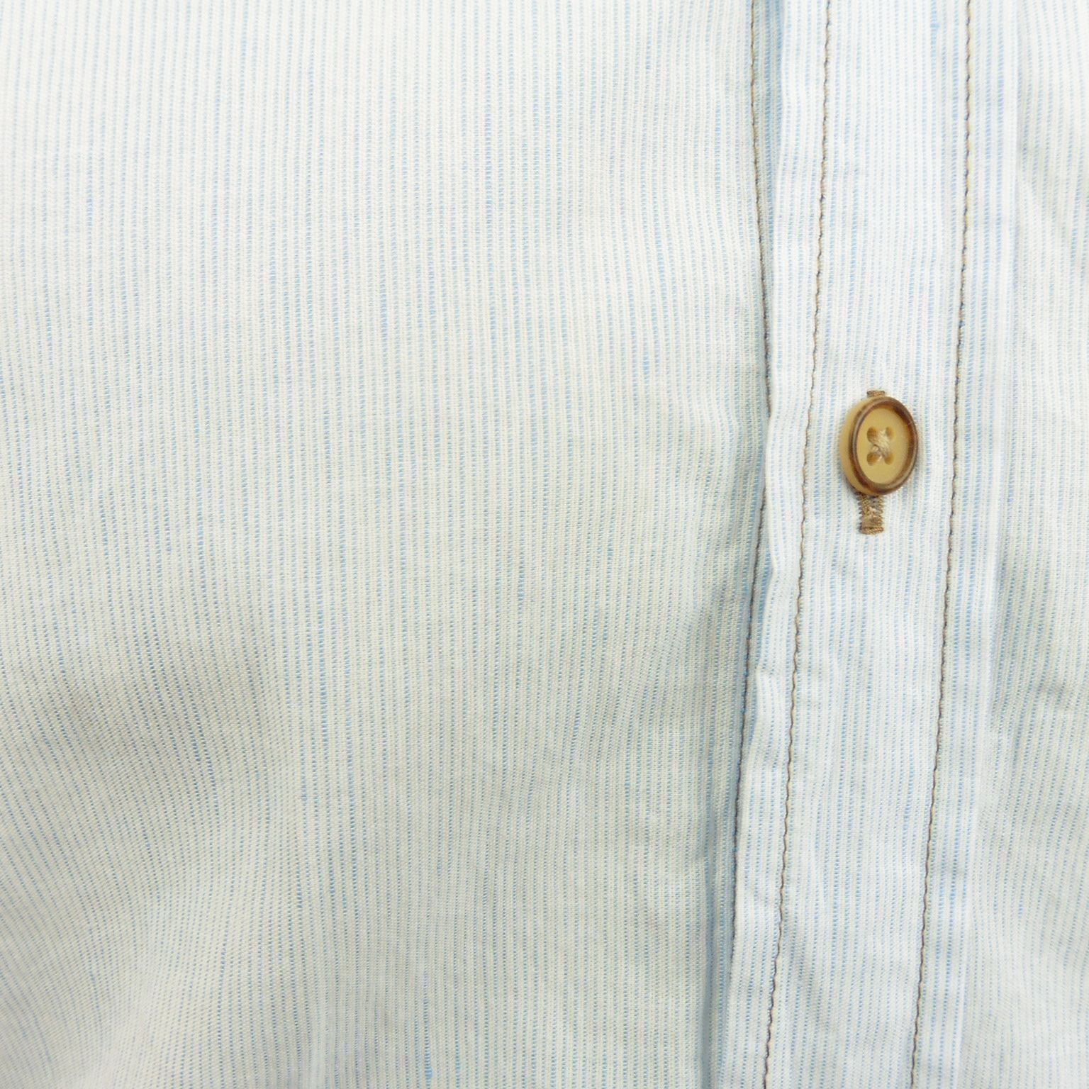 Camisa de Corsare, 60% algodón 40% poliéster, tejido fino, cuello botones, fondo blanco con mil rayas en tonos celeste, hilo y botones en contraste en tono camel