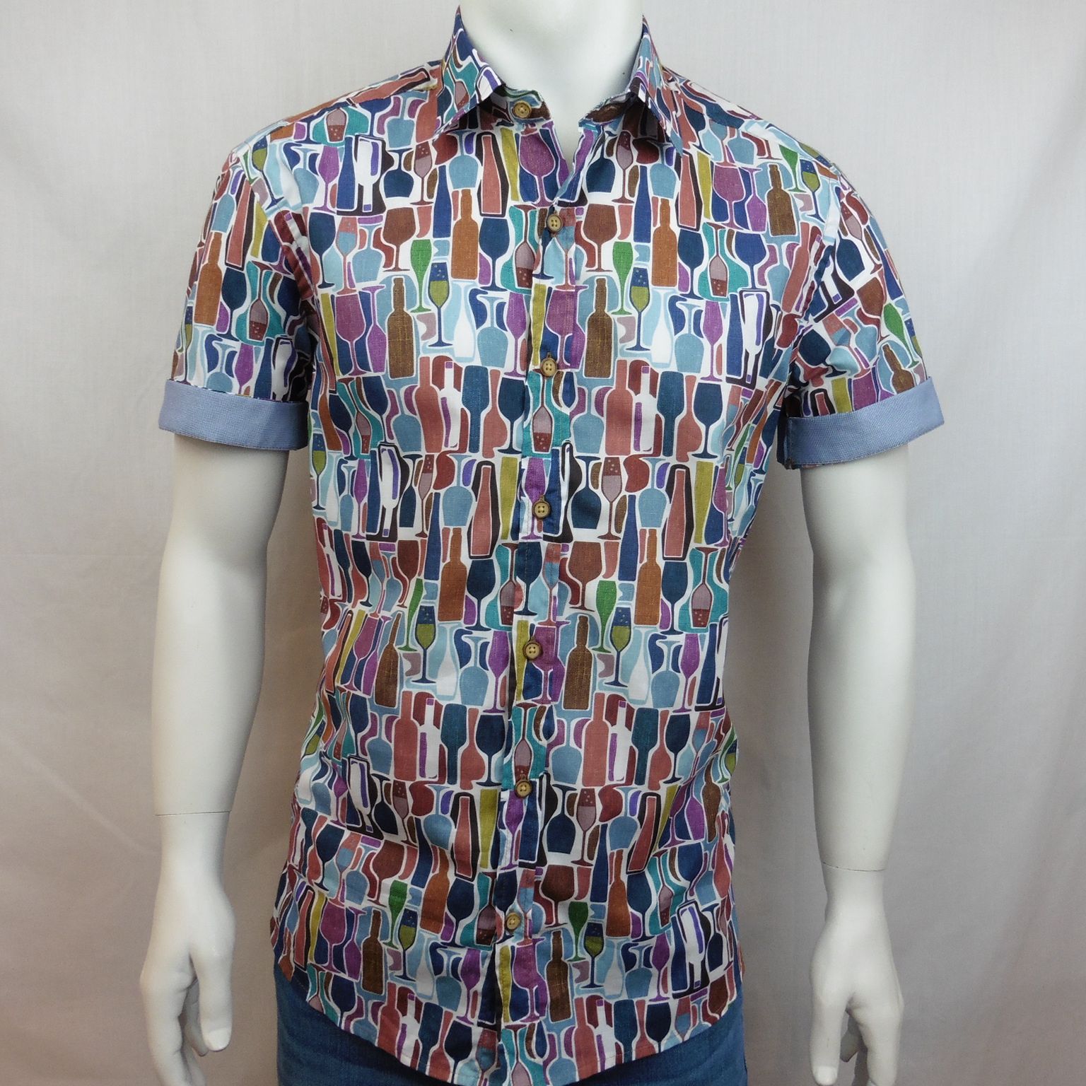 Camisa de Corsare, 100% algodón voile, de manga corta con dobladillo de tela en tono azul, cortes laterales, con estampado de copas multicolor