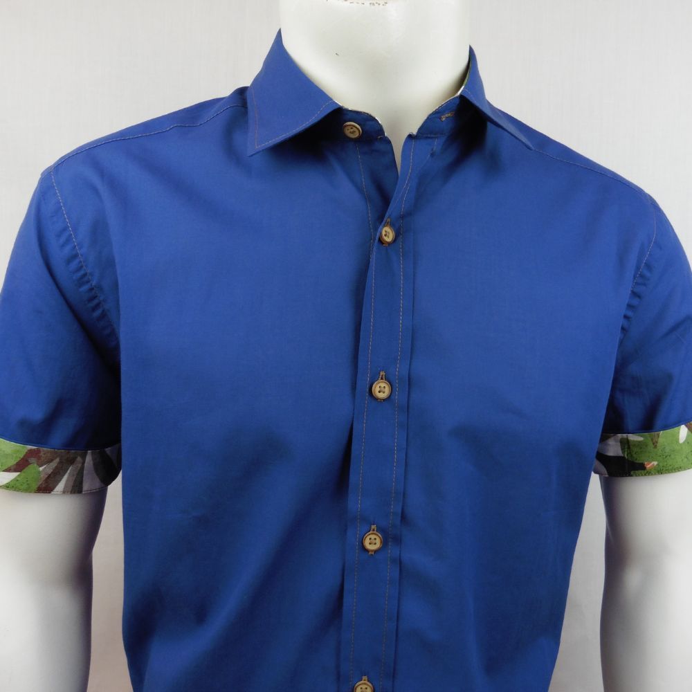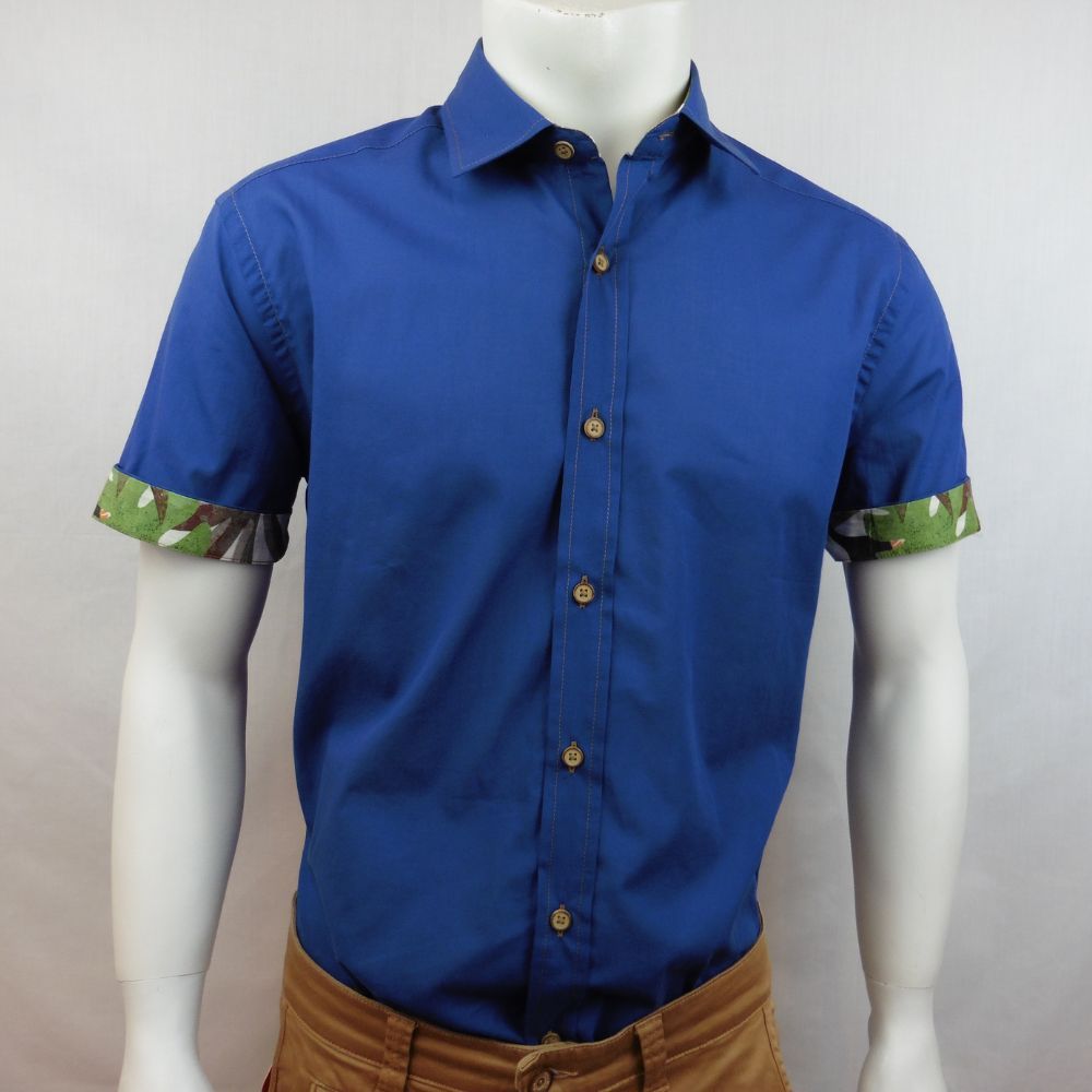 Camisa de corsé, 100% algodón voile de manga corta, con cortes laterales, en color azul tinta con hilo en contraste en tono naranja y con doble puño de la manga en estampado.