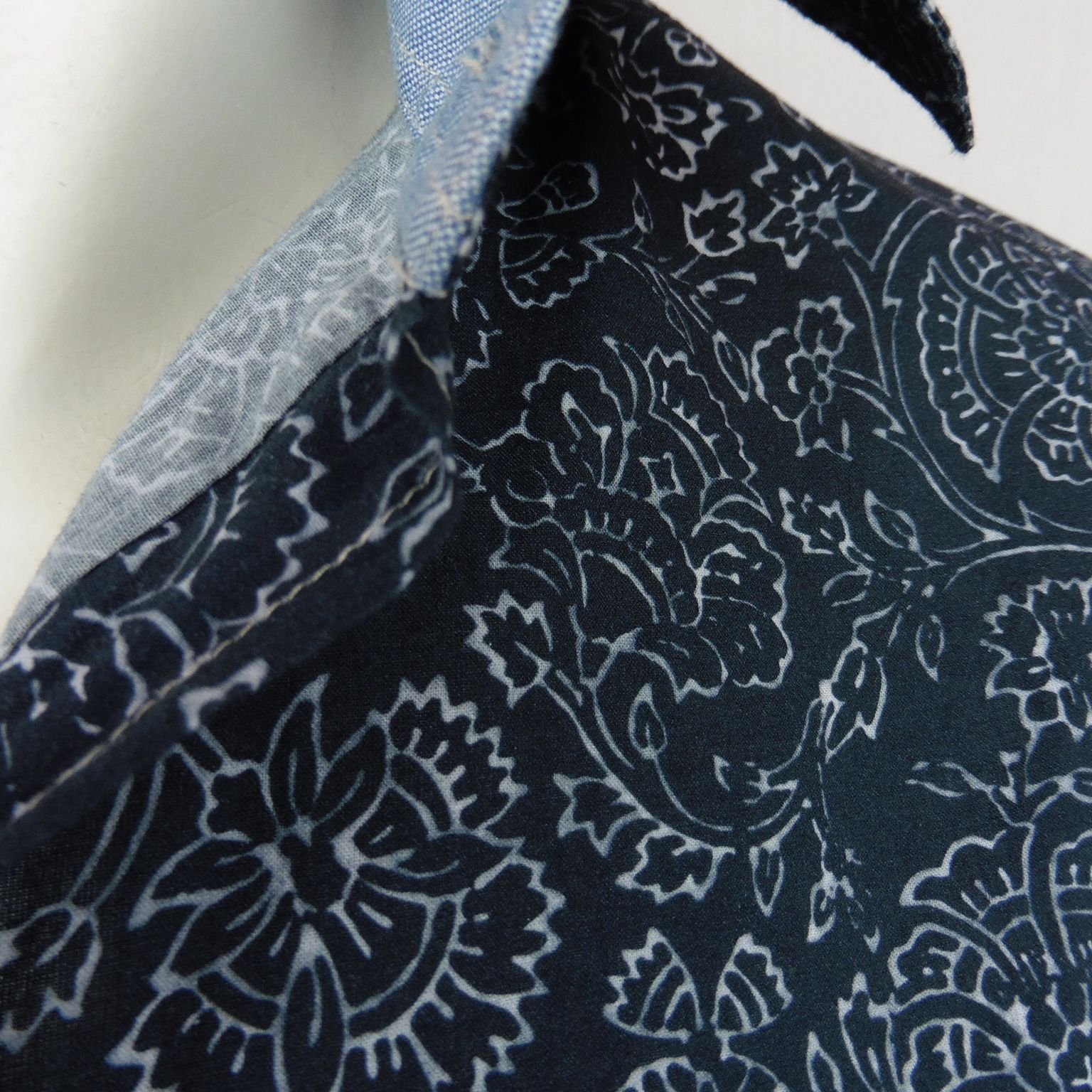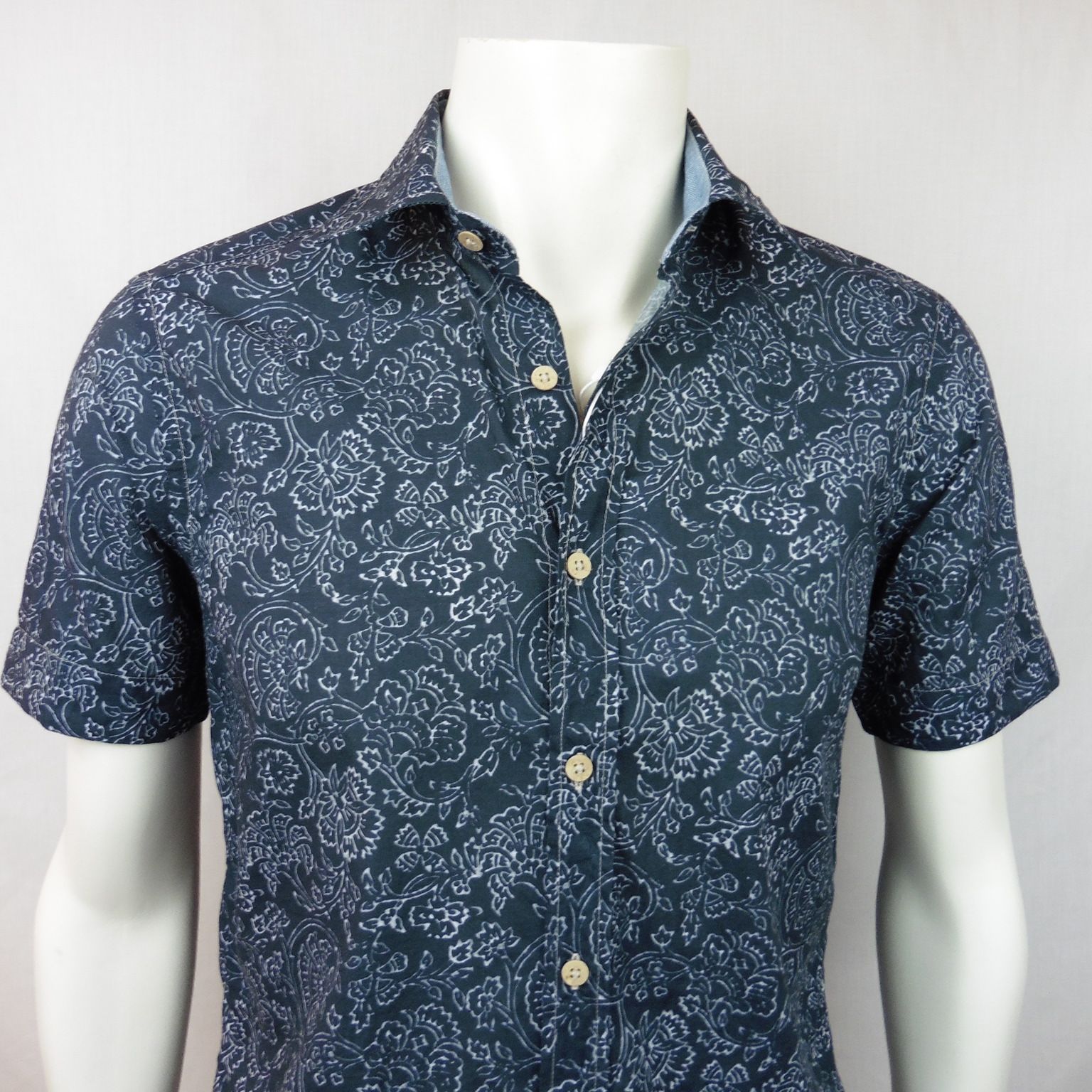 Camisa de Corsare, 100% algodón voile, de manga corta con dobladillo de tela en tono azul, cortes laterales, en color azul marino con estampado de flores blancas