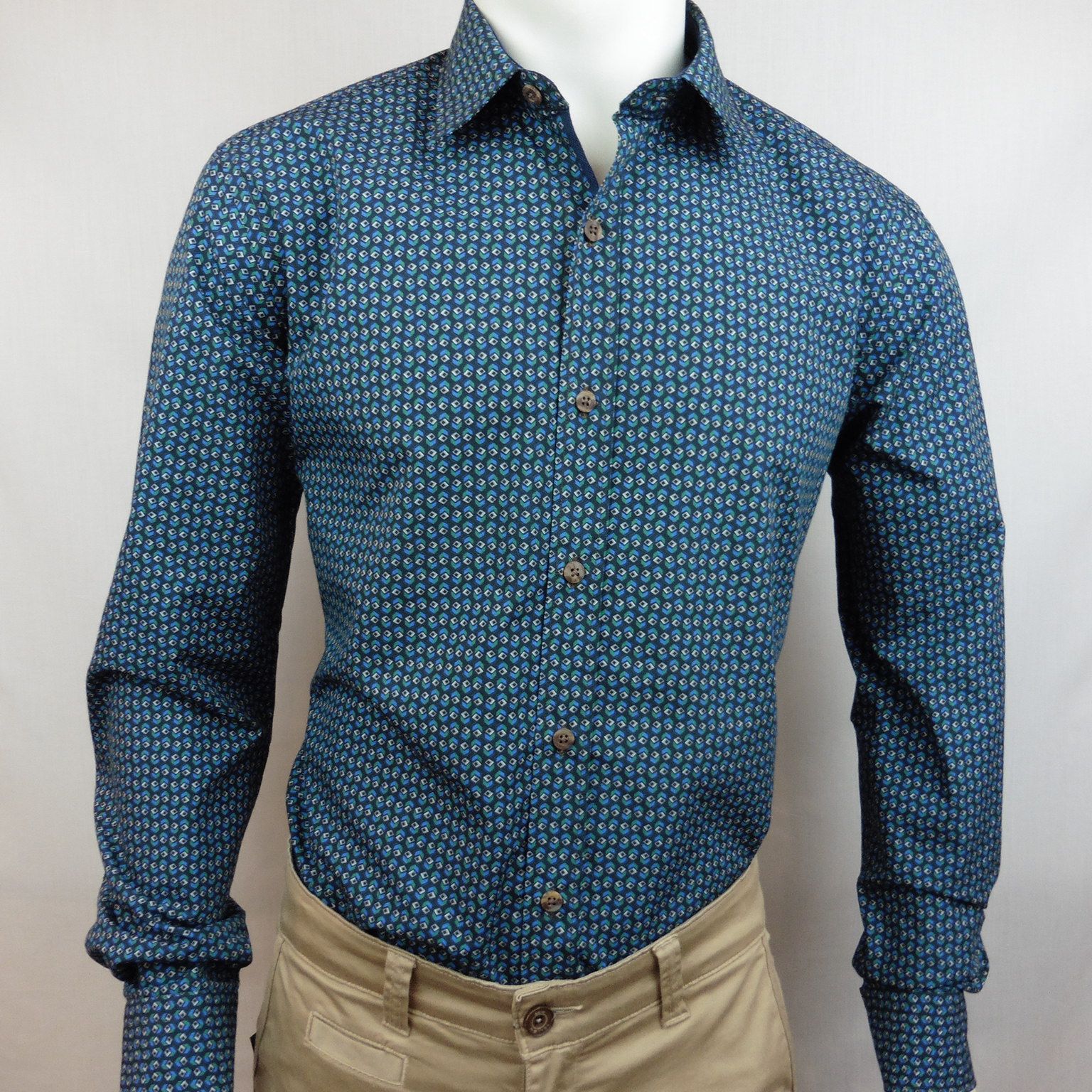 Camisa de Corsare, 100% algodón, entallada con pinzas en la espalda, en color negro con estampado de cubos en tonos verde, azul y gris claro, cuello italiano