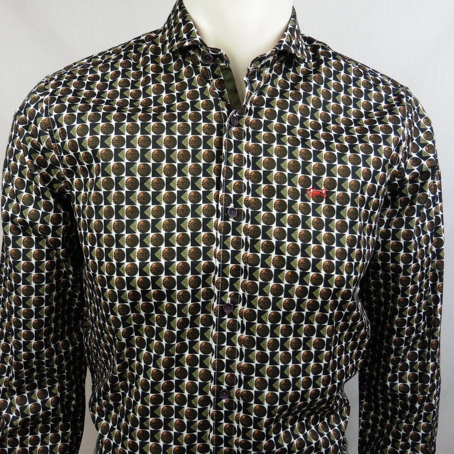 Camisa de Dark & Fish, 97% algodón 3% elastomero, con estampado geométrico en tonos camel, verde y negro con fondo blanco, interior de cuello y puños en color caldera con vivo verde