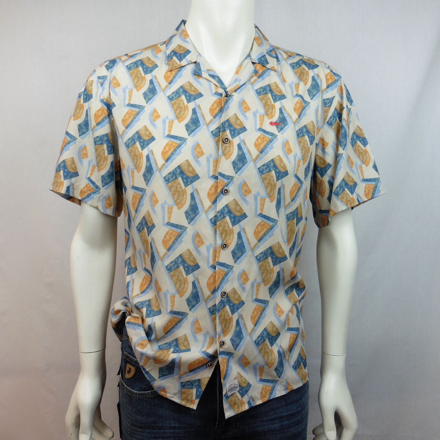 Camisa de Dark & Fish, 100% viscosa, de manga corta, en color beige  con dibujos geométricos en tonos marrones y azules