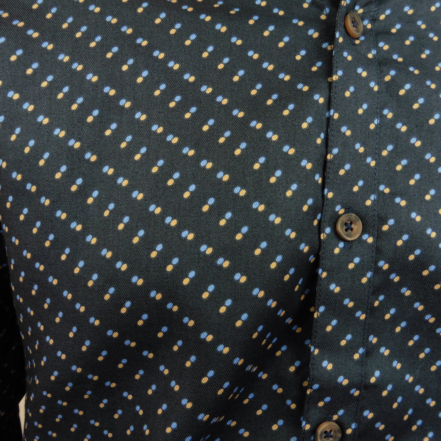 Camisa de Dos Galgos, 100% algodón, botón en el cuello, en color azul marino con topos en tonos camel y azul