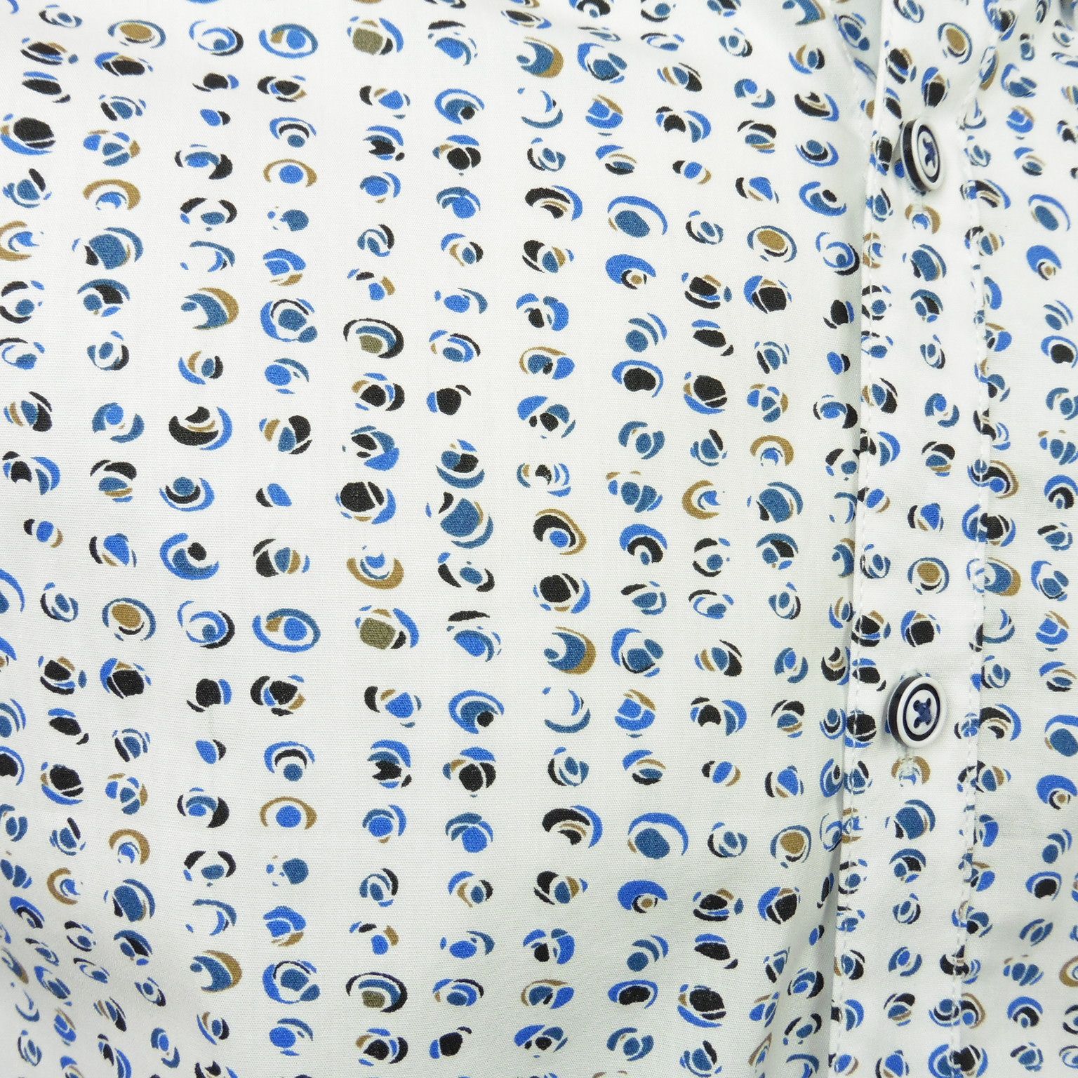 Camisa de Dos Galgos, 100% algodón, en color blanco con estampado de círculos partidos en tonos azules y camel