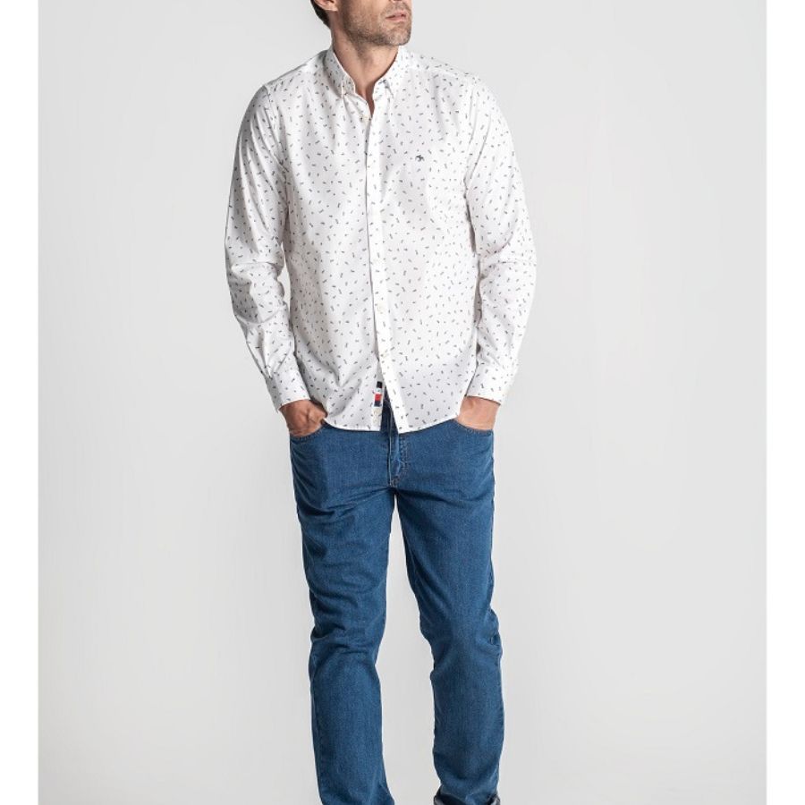 Camisa de Dos Galgos, 100% algodón, botón en el cuello, en color blanco con estampado de figuras de ajedrez en color azul marino