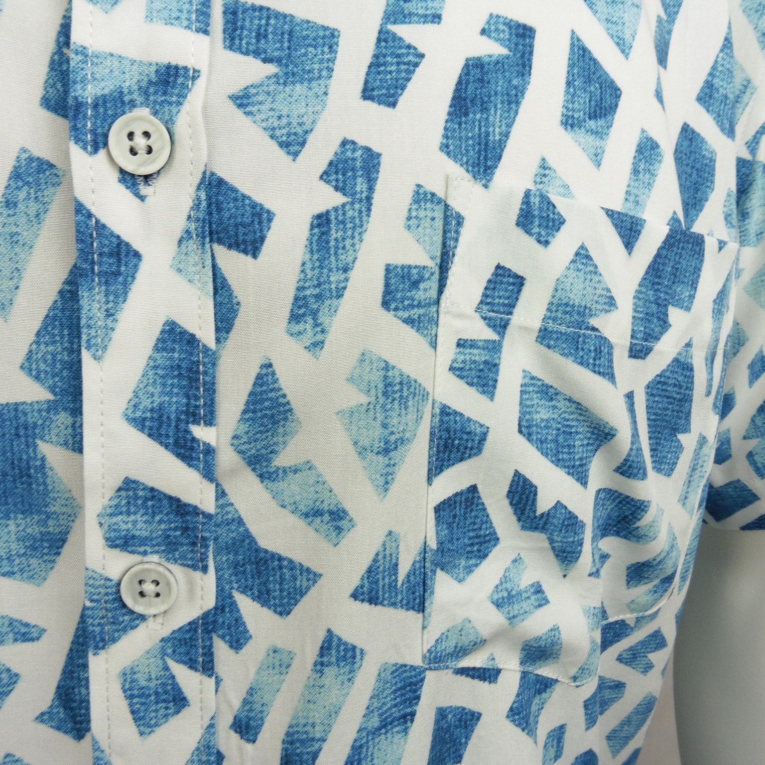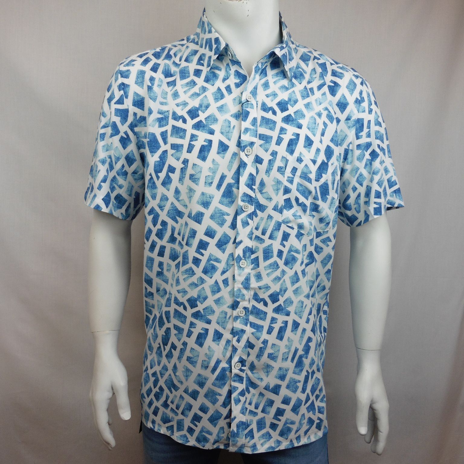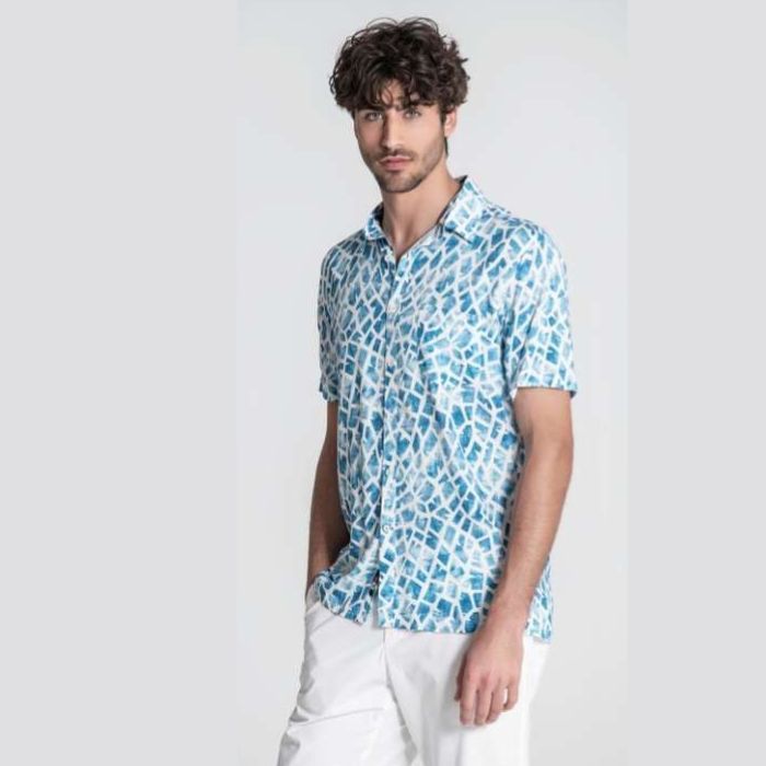 Camisa de Dos Galgos, 100% viscosa, 1 bolsillo, en color blanco con estampado de puzzle en tonos azules