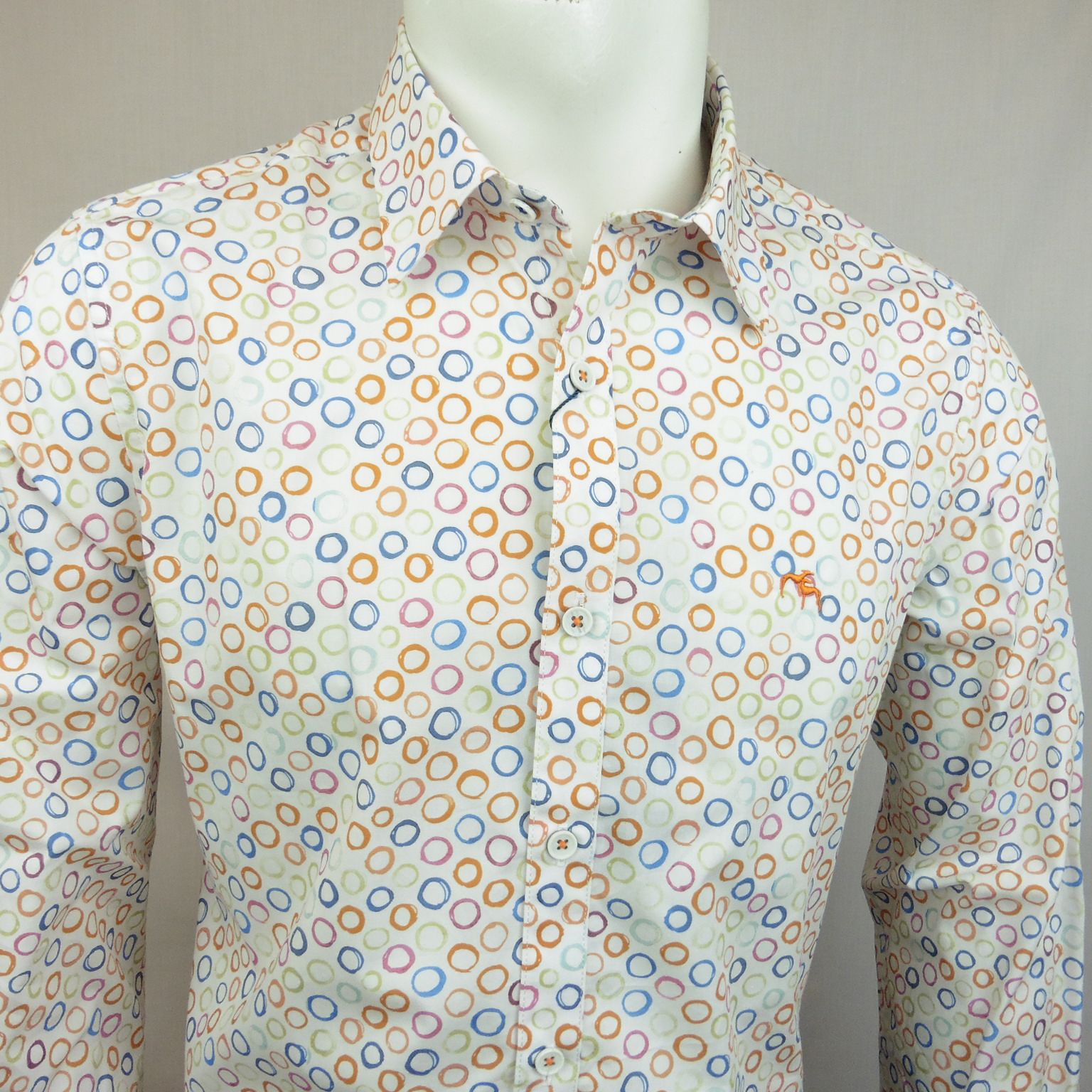 Camisa de Dos Galgos, 100% algodón, en color blanco con estampado de aros de colores en tonos naranja, rosa, azul, verde y rosa