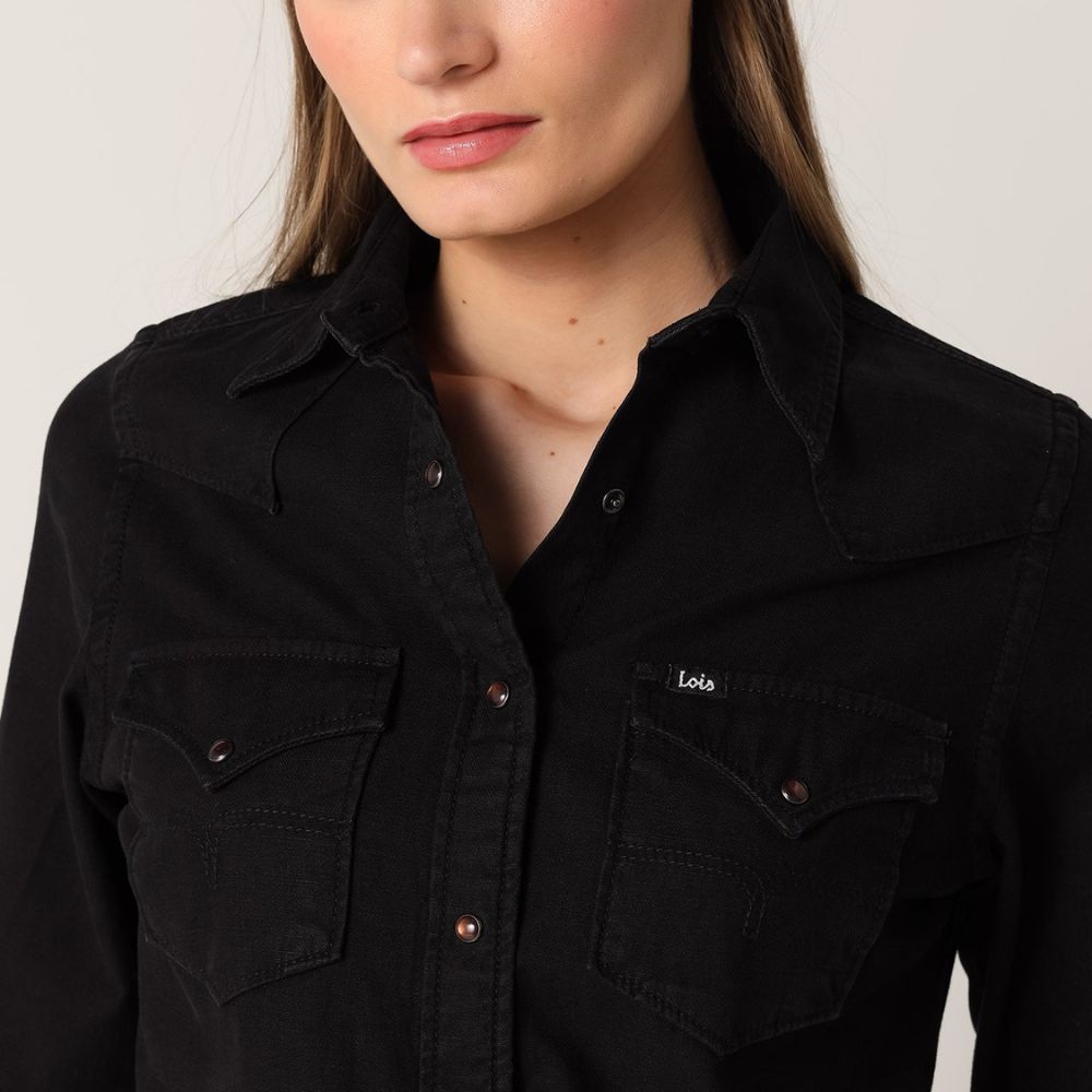 Camisa vaquera de Lois, 100% algodón, dos bolsillos con tapa y canesú, en color negro