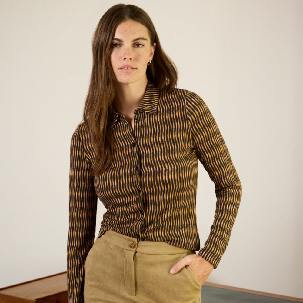 Camisa de punto de Surkana, 50% poliéster reciclado 45% poliéster 5% elastano, de punto de cálido, estampado vertical en tonos negro, mostaza y rosa