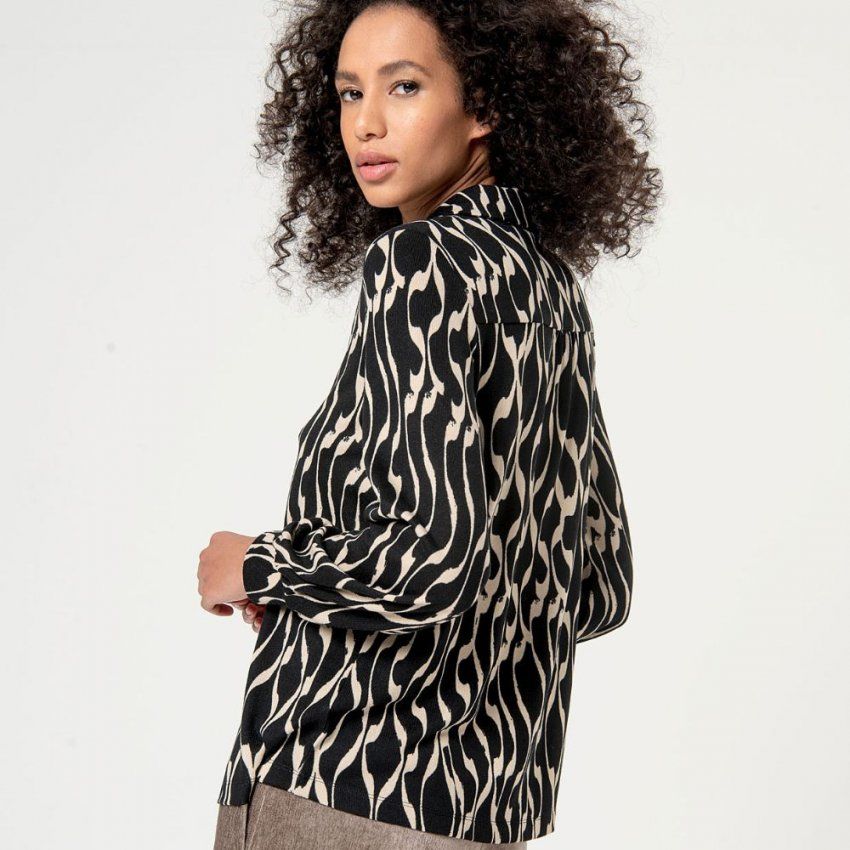 Camisa de punto de Surkana, 50% poliéster reciclado 45% poliéster 5% elastano, escote en uve, mangas con puños, estampado abstracto vertical en tonos crudo y negro