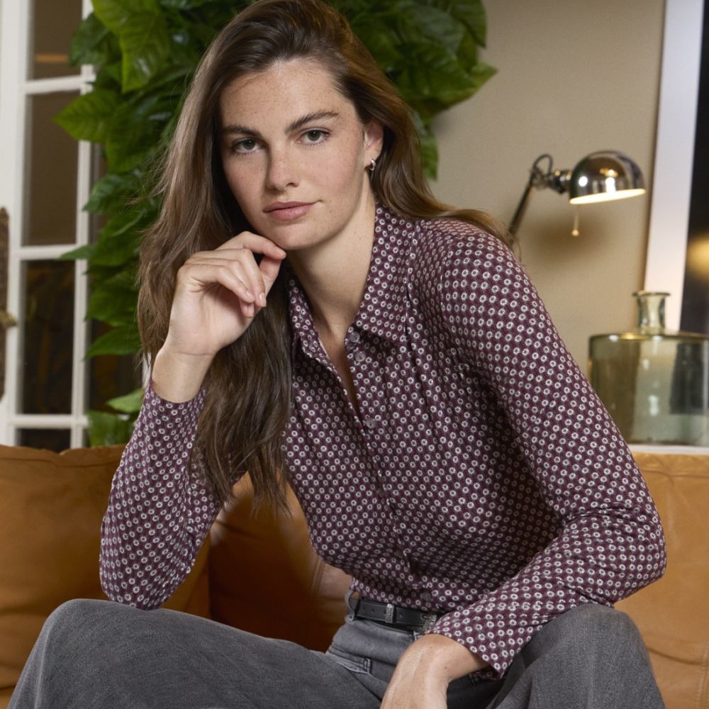 Camisa de punto de Surkana, 50% poliéster reciclado 46% poliéster 4% elastano, en color gris con estampado de flores pequeñas en tonos granate yblanco