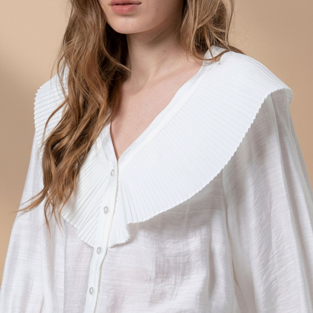 Camisa de Surkana, cuerpo 80% viscosa 20% poliamida, cuello 60% poliester 40% algodón, en color blanco, cuello plisado y escote pico, mangas abullonadas