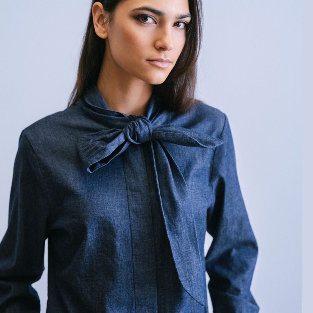 Camisa de WNT Collection, 98% algodón 2% elastan, en color azul vaquero, con tapeta cubre botones y lazada en cuello