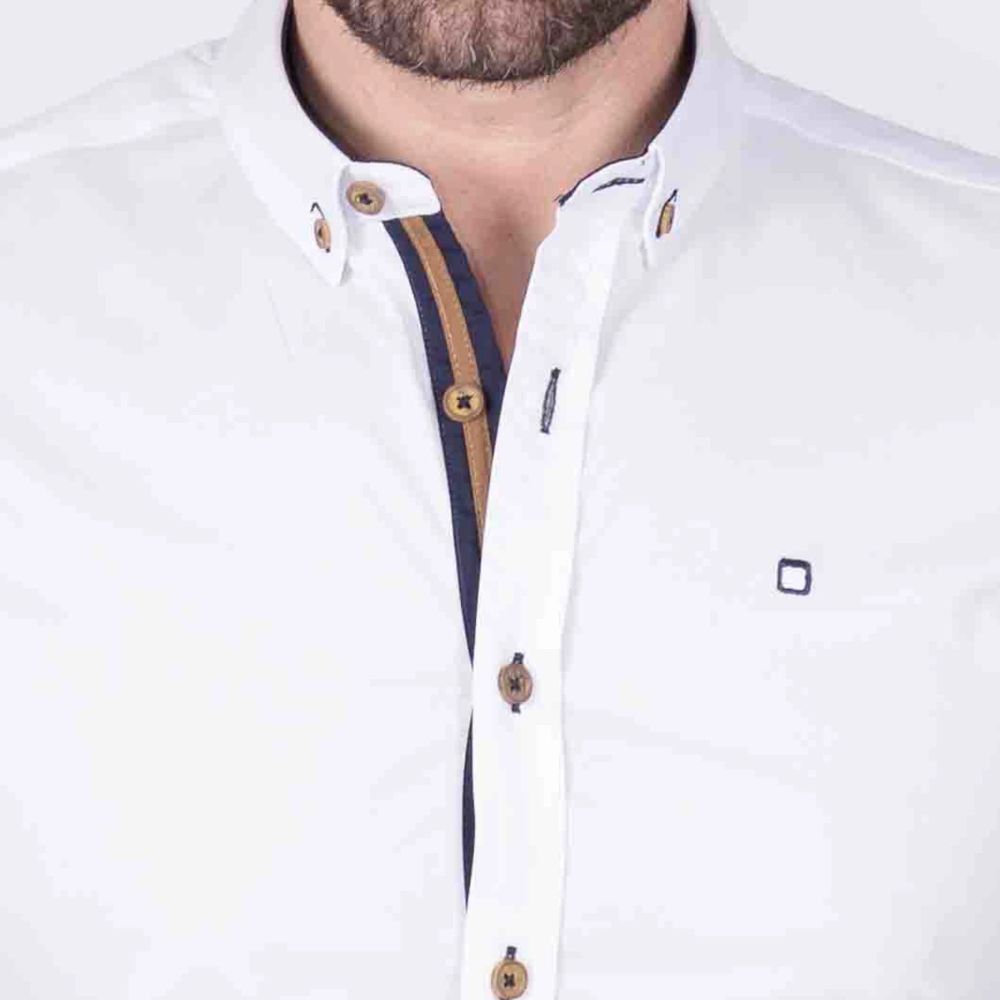 Camisa de Yellow Skin, 34% algodón 62% poliéster 4% elastano, botón en el cuello, tejido haciendo canutillo en color blanco con tapeta interior en color azul, puño interior en color camel y azul, coderas en color azul marino