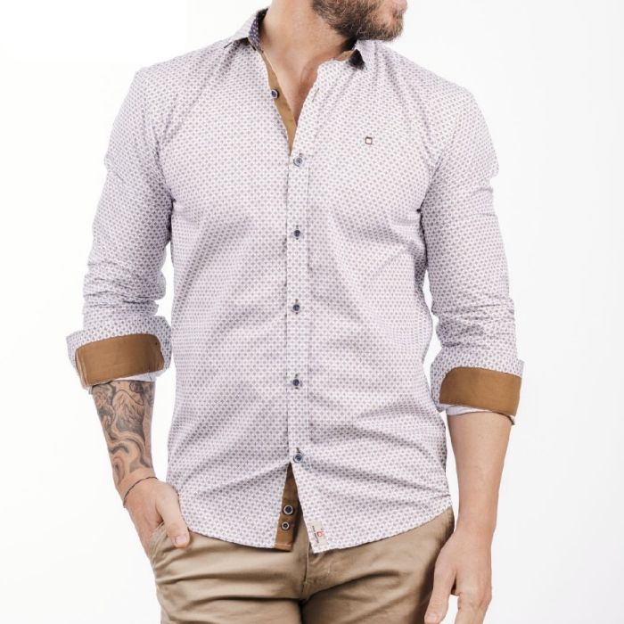 Camisa de Yellow Skin, 100% algodón, con dibujo en color camel y celeste en fondo blanco, tapeta y puños interiores en color camel