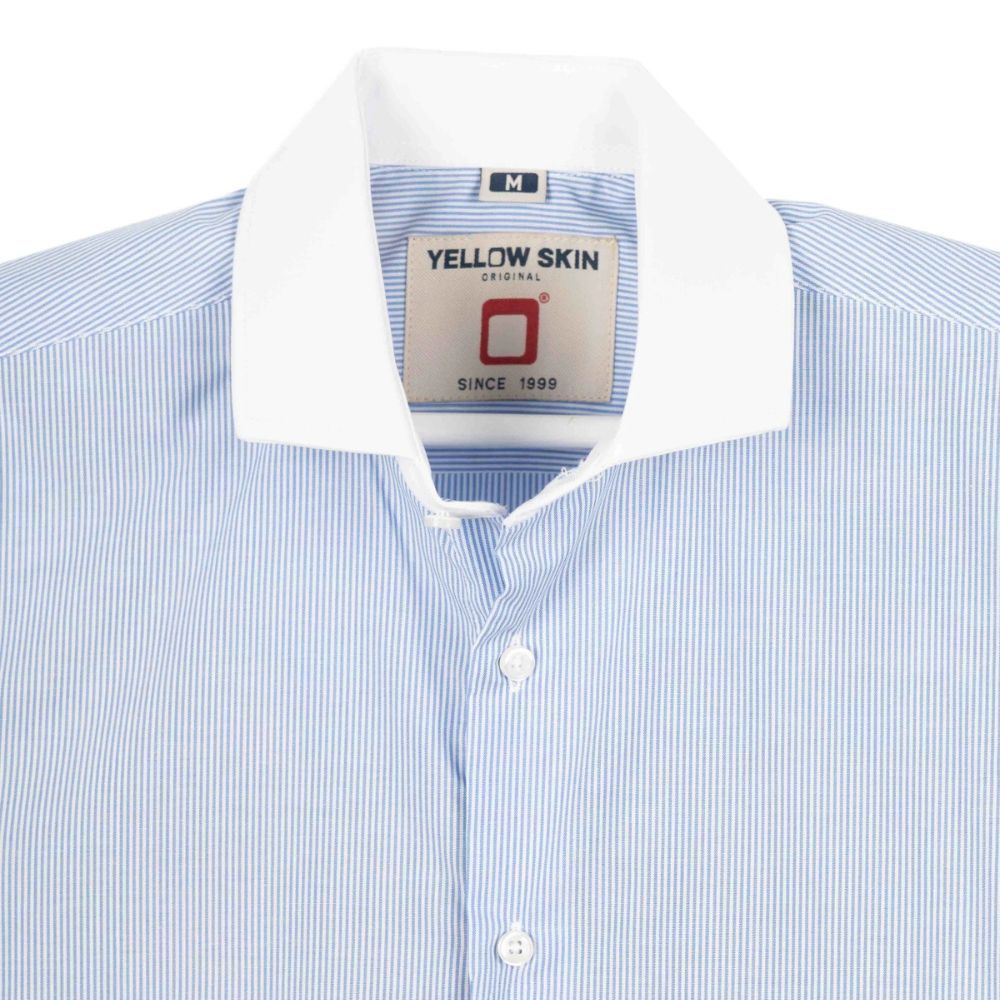 Camisa de Yellow Skin, 35% algodón 65% poliéster, de mil rayas azules y blancas, cuello y puños en color blanco