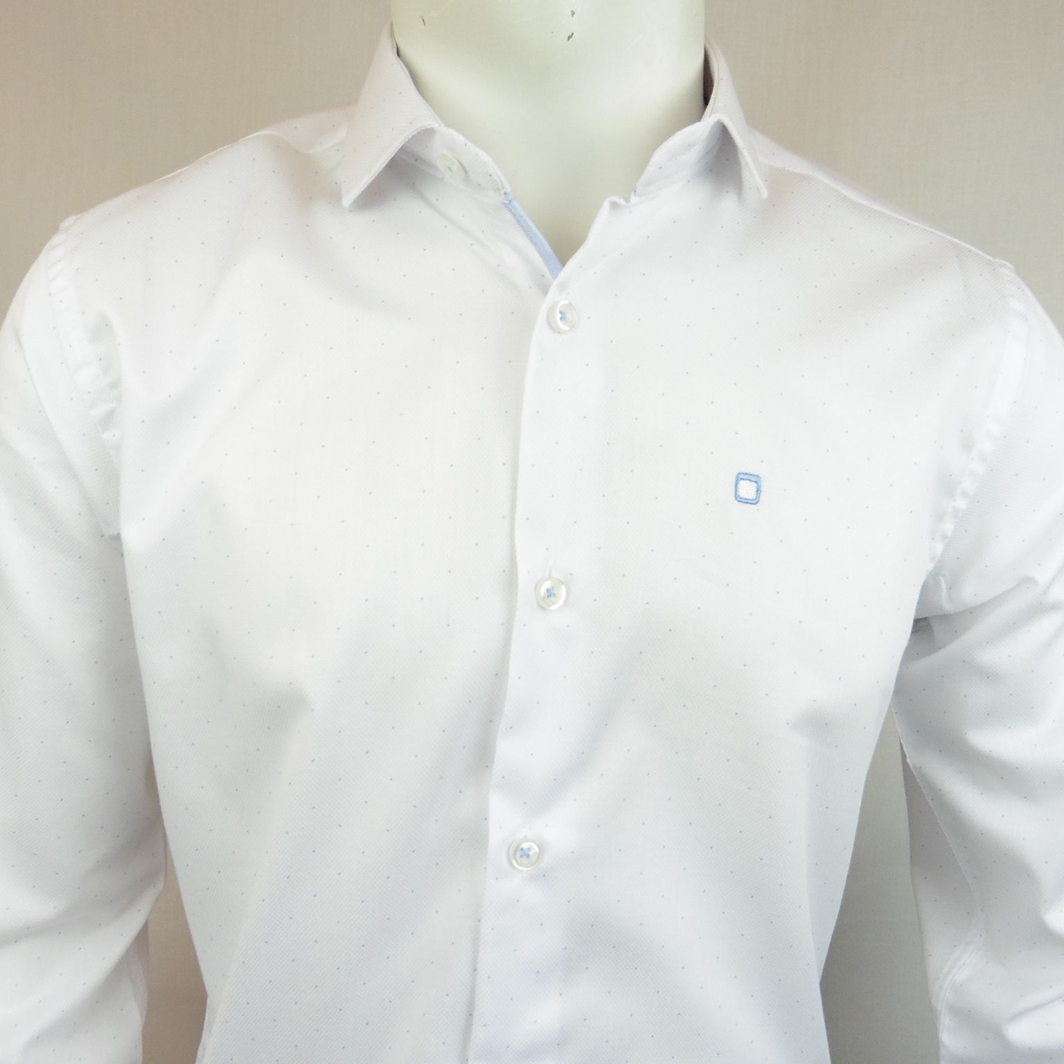 Camisa de Yellow Skin, 65% algodón 35% poliéster, cuello de vestir, tejido haciendo mini panal en color blanco con topos en color celeste, puño interior en color celeste