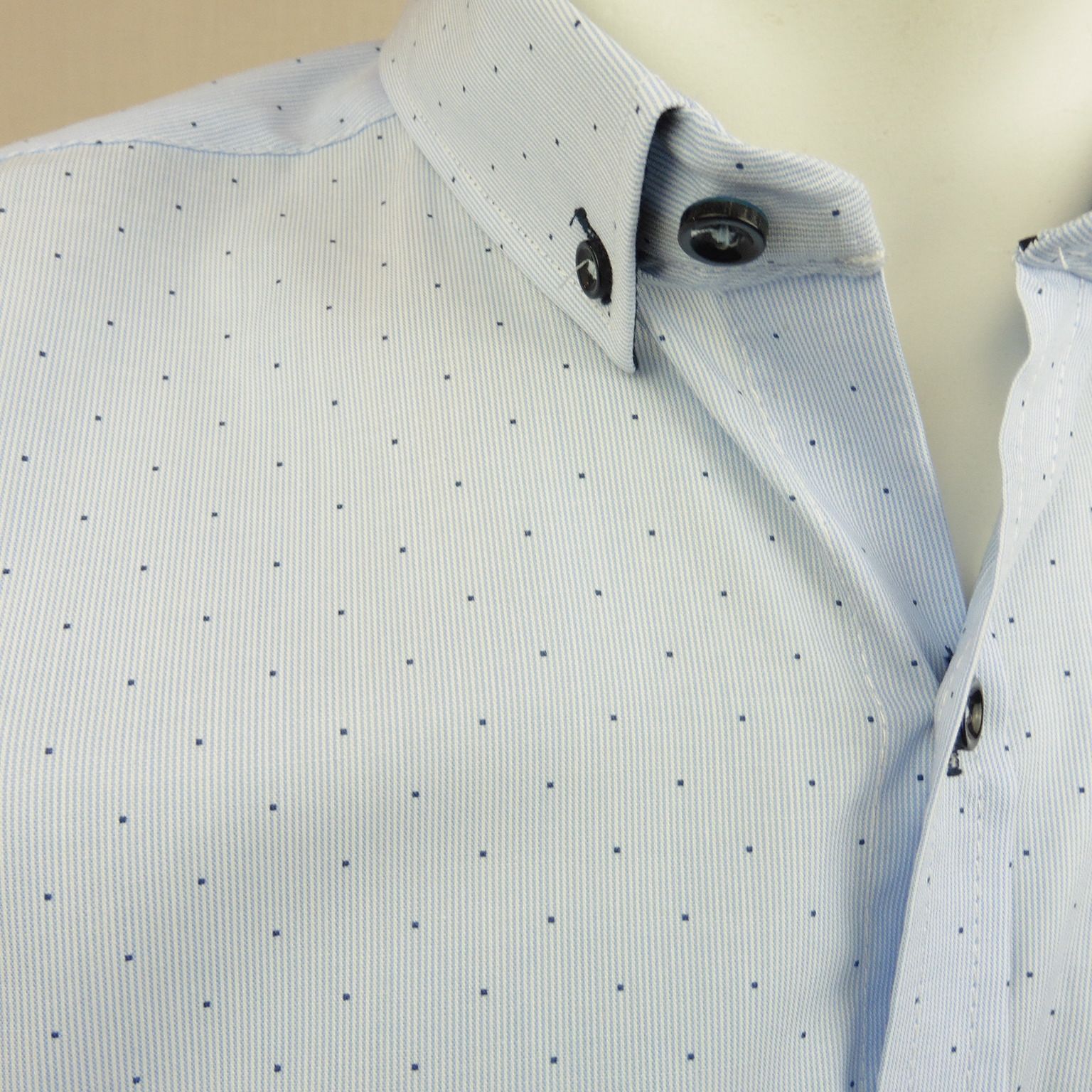 Camisa de Yellow Skin, 65% algodón 35% poliéster, botones en el cuello, mil rayas celeste y blanco con topos en color azul marino, puño interior en color azul marino