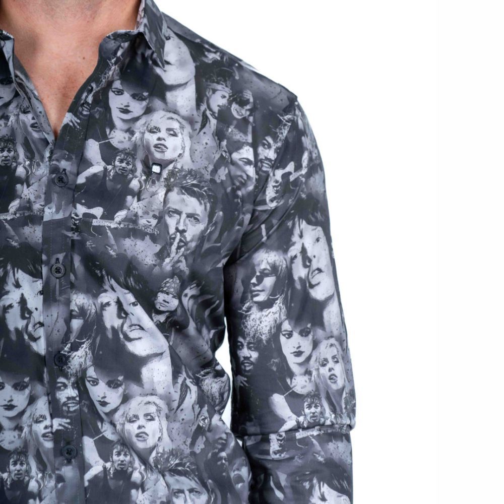 Camisa de Yellow Skin, 97% algodón 3% elastomero, con estampado de caras de cantantes de rock en tonos grises