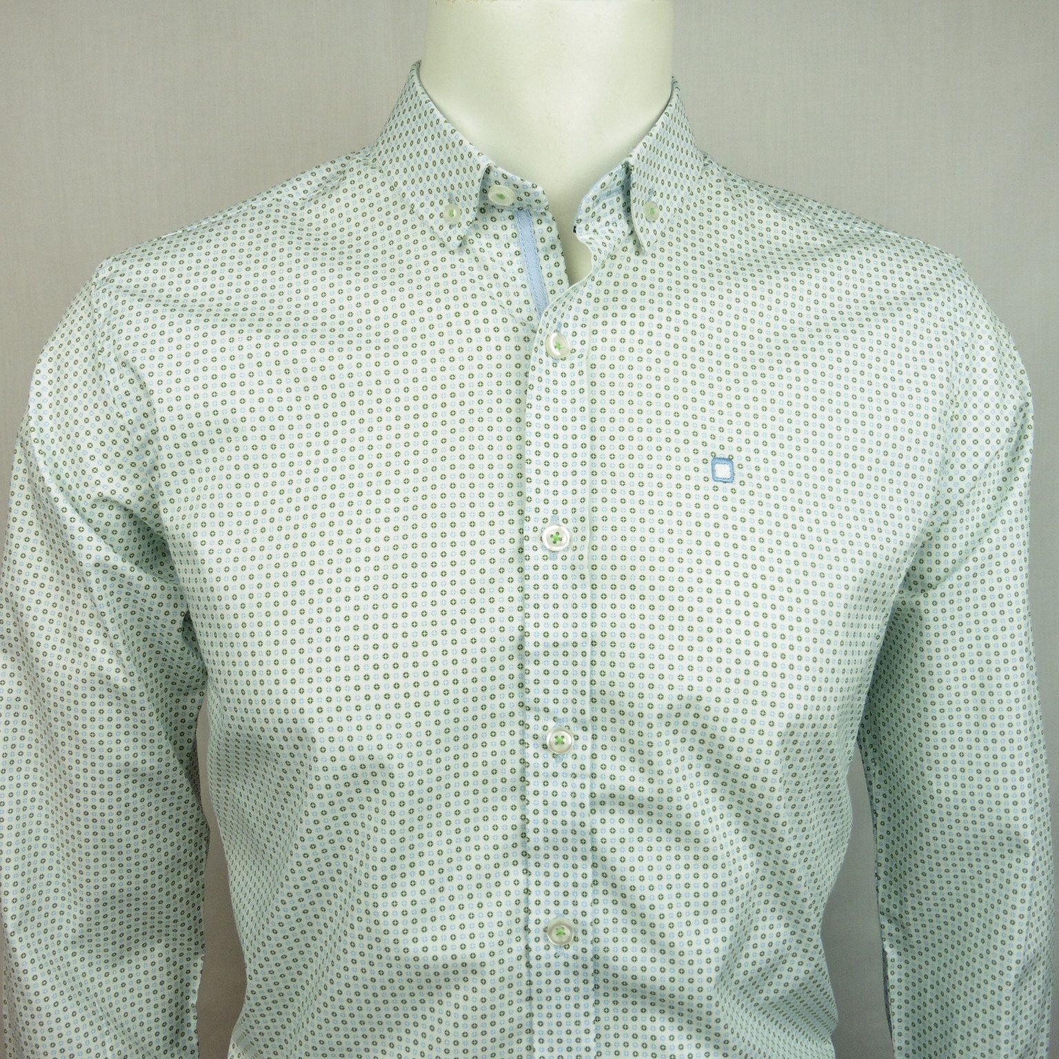 Camisa de Yellow Skin, 97% algodón 3% elastano, botones en el cuello, en color blanco con mini dibujo en color azul y verde, puño interior en color celeste