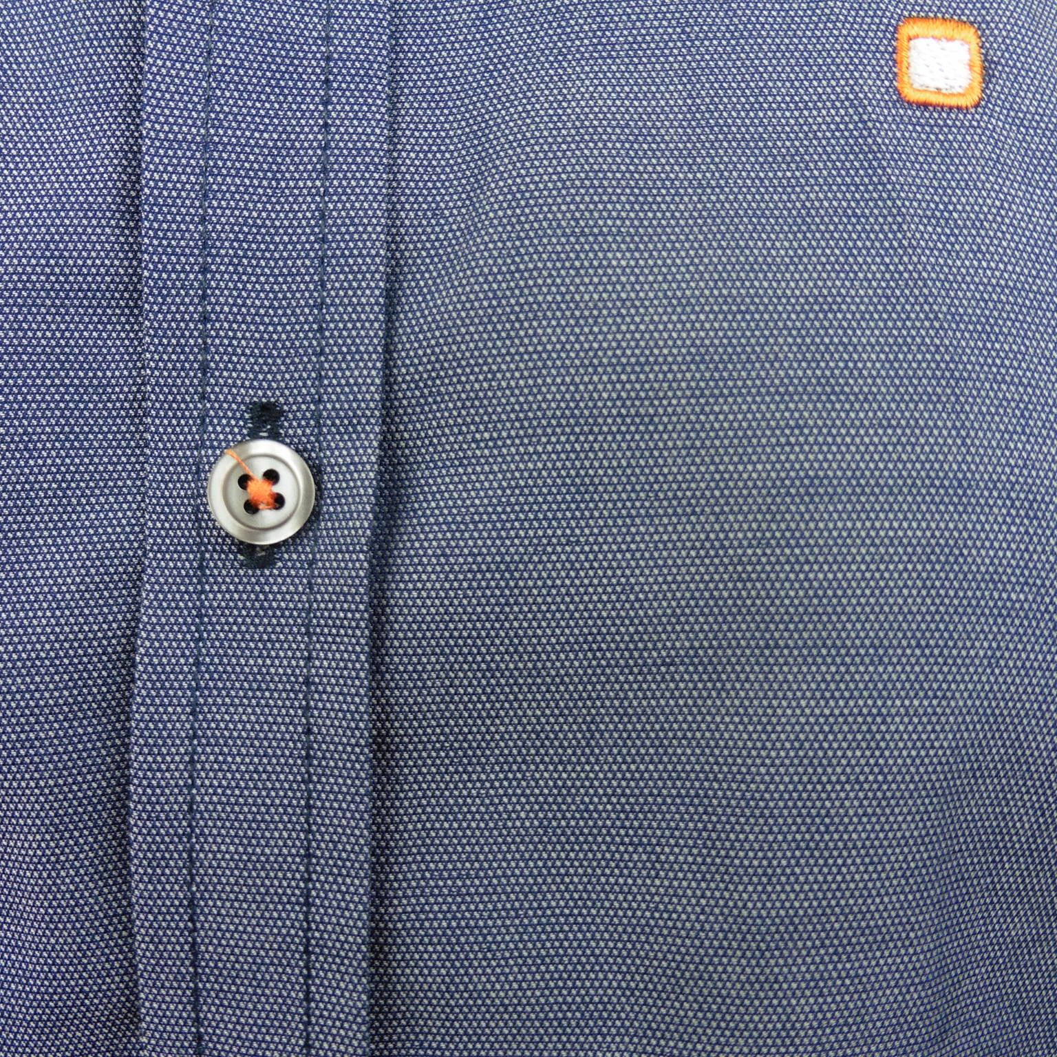 Camisa de Yellow Skin, 100% algodón, botón en el cuello, en color azul marino con  micro dibujo gris perla, detalle estampado en interiores de los puños, hilo naranja en los botones