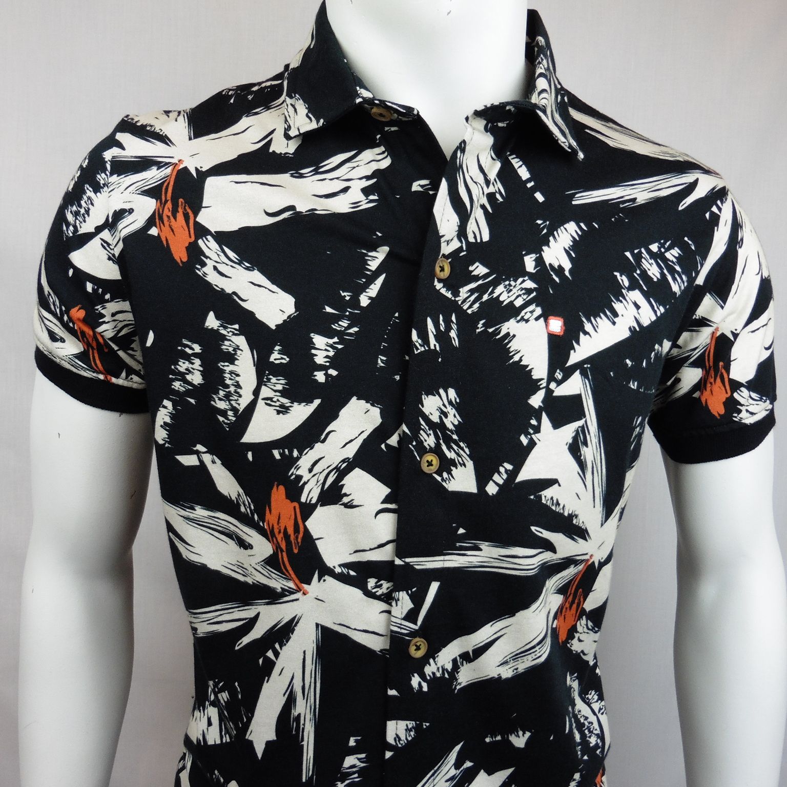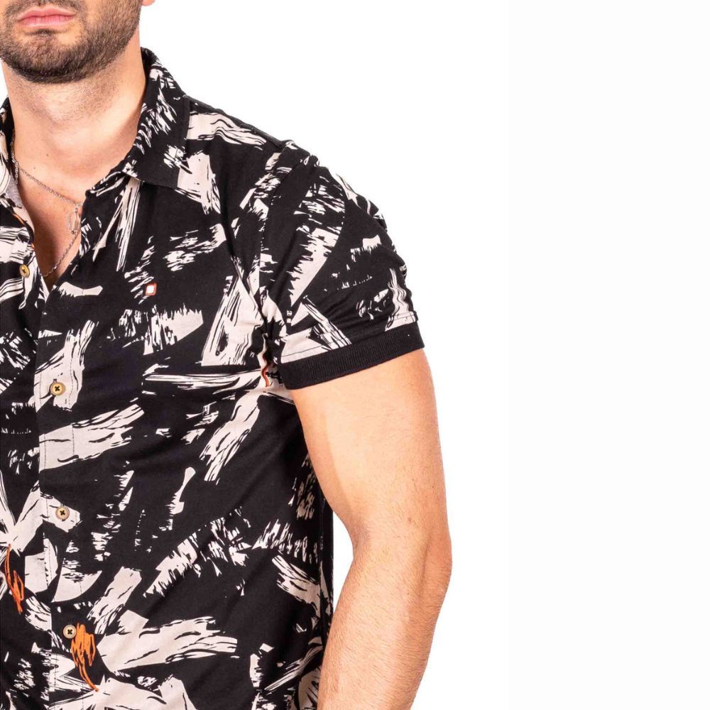 Camisa-Polo de Yellow Skin, 100% algodón, en color negro con estampado grande en tonos beige y naranja, con pie de cuello, puños en color negro